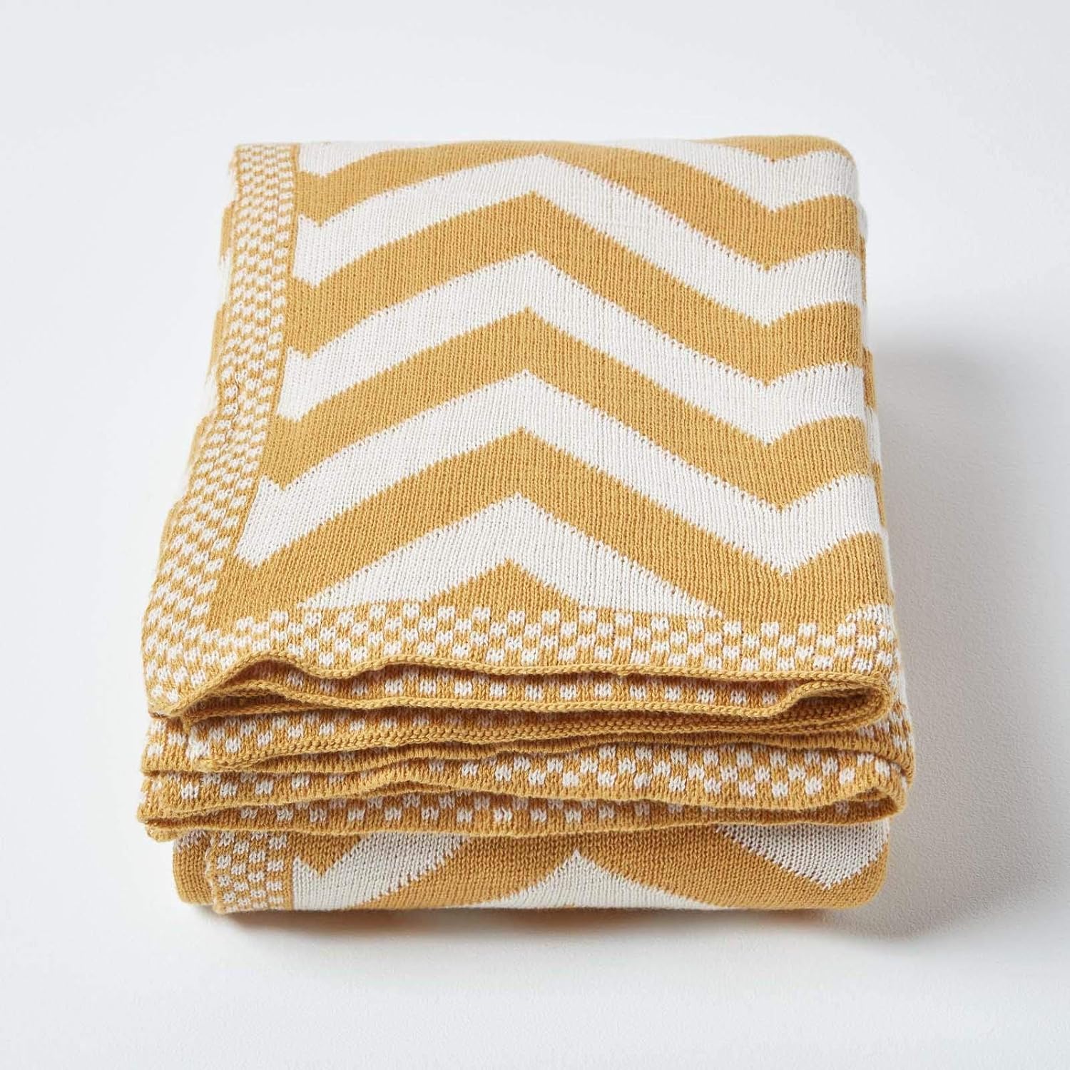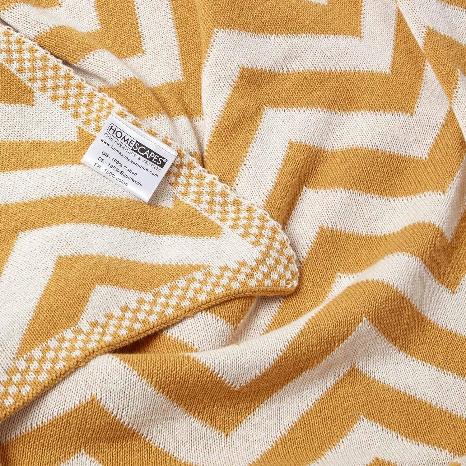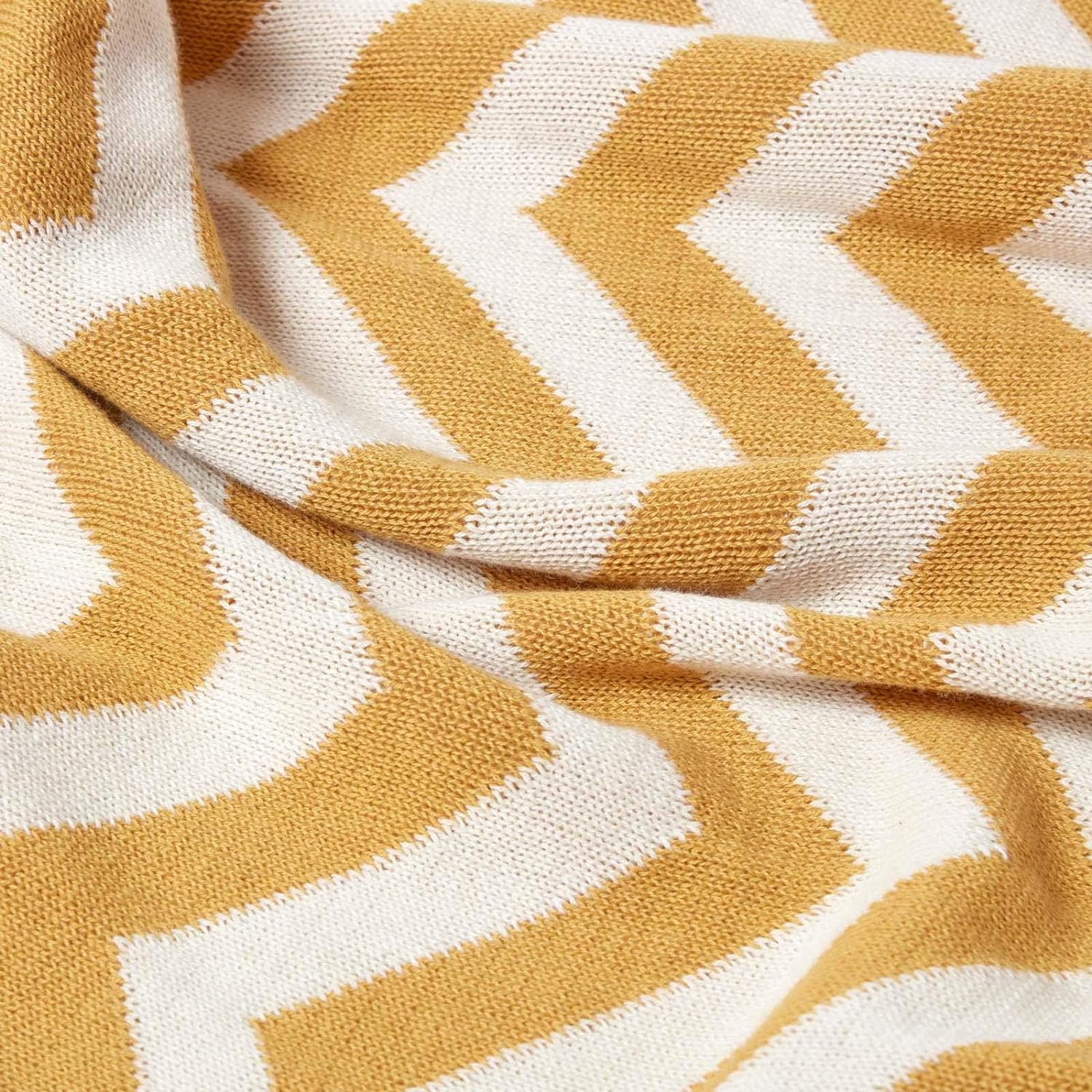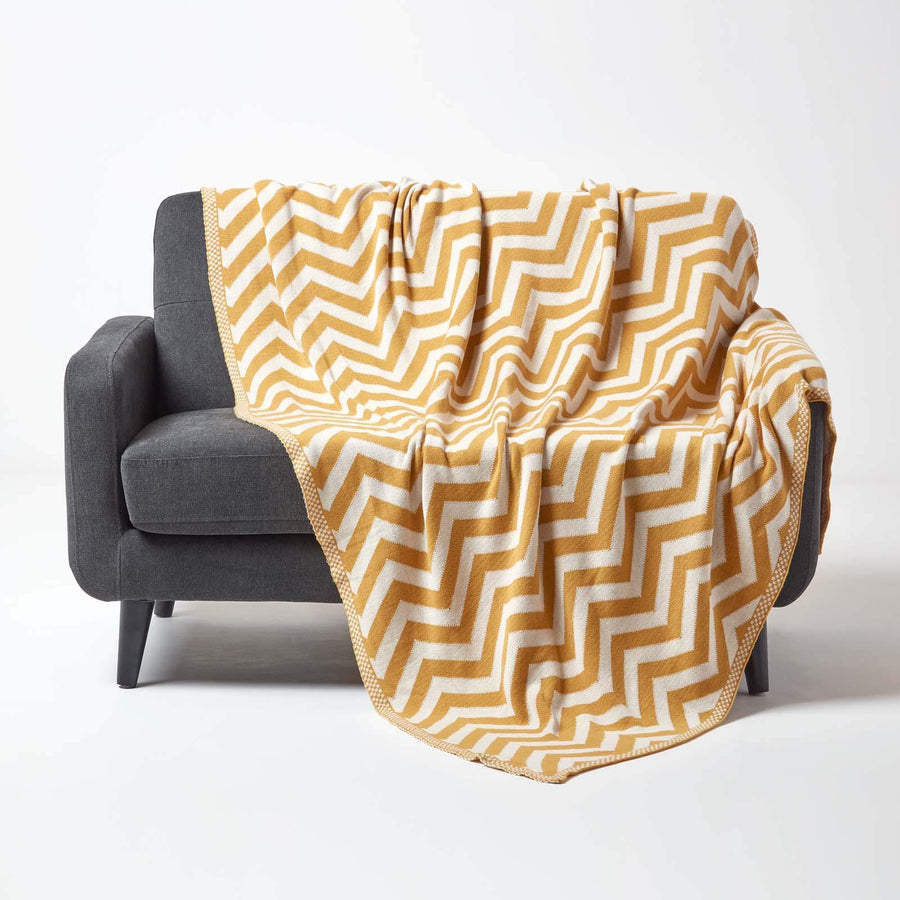 - Gestrickte Wohndecke für Sofa oder Bett mit geometrischem Muster. Masse: ca. 150 x 200. Farbe: senfgelb und cremeweiss.