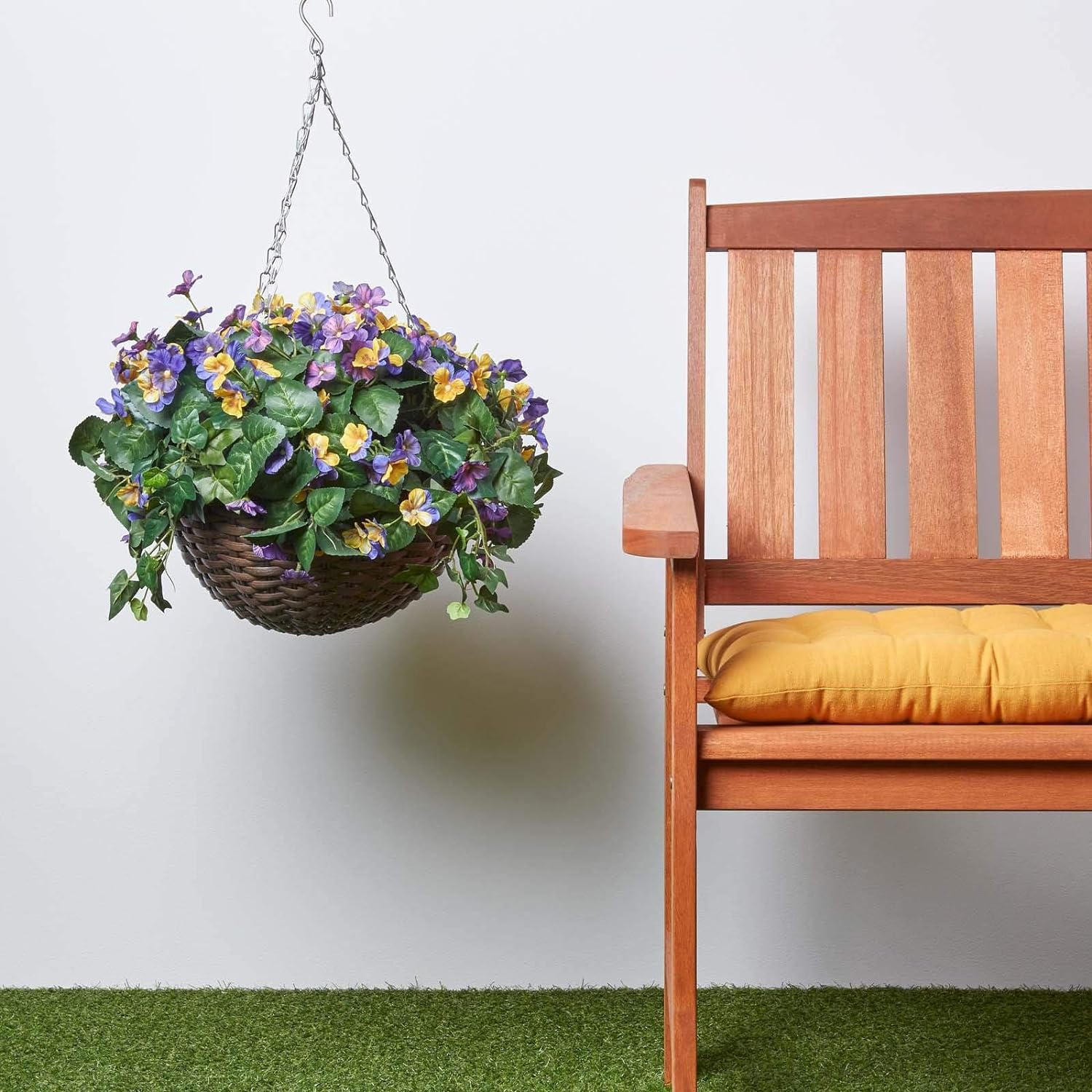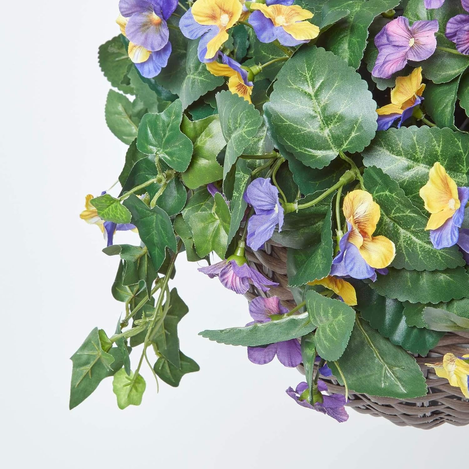 - Hängendes künstliches Stiefmütterchen mit Weidenkorb, Kette und Haken. Grösse ca.: H60 x B38 cm, Topf Durchmesser: 30 cm, Gewicht: 0,65kg. Farbe: lila und gelb