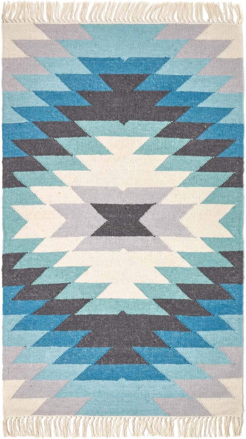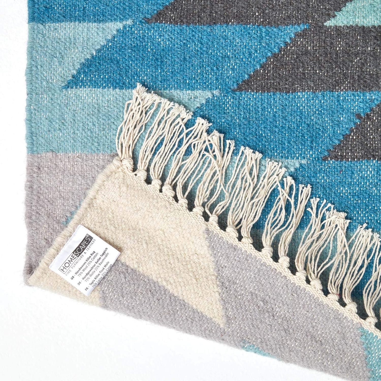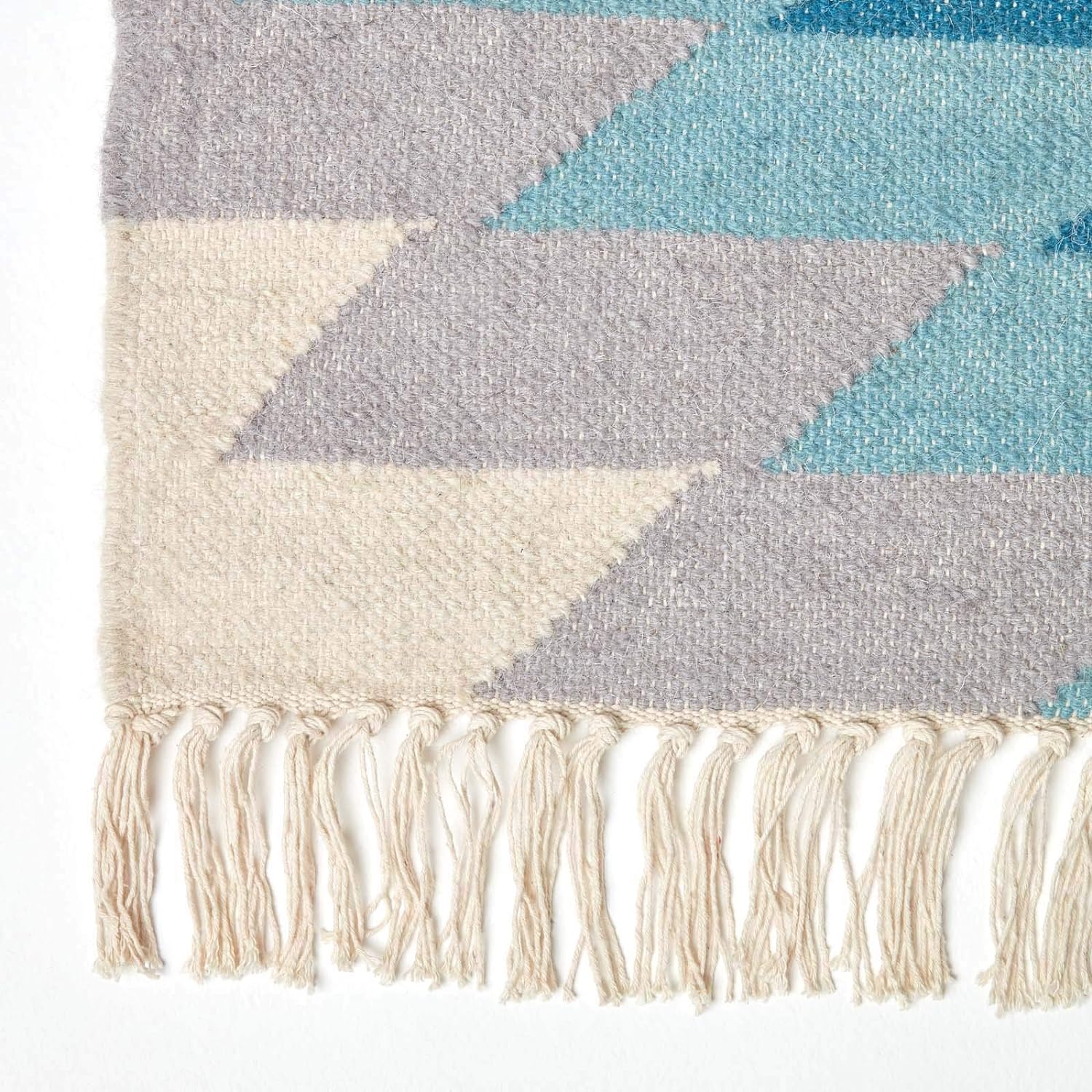 - Hochwertiger Wollteppich Helsinki mit traditionellem geometrischem Muster im behaglichen Scandi-Look. Grösse: ca. 120 x 170 cm. Mehrfarbig: blau-weiss-grau.
