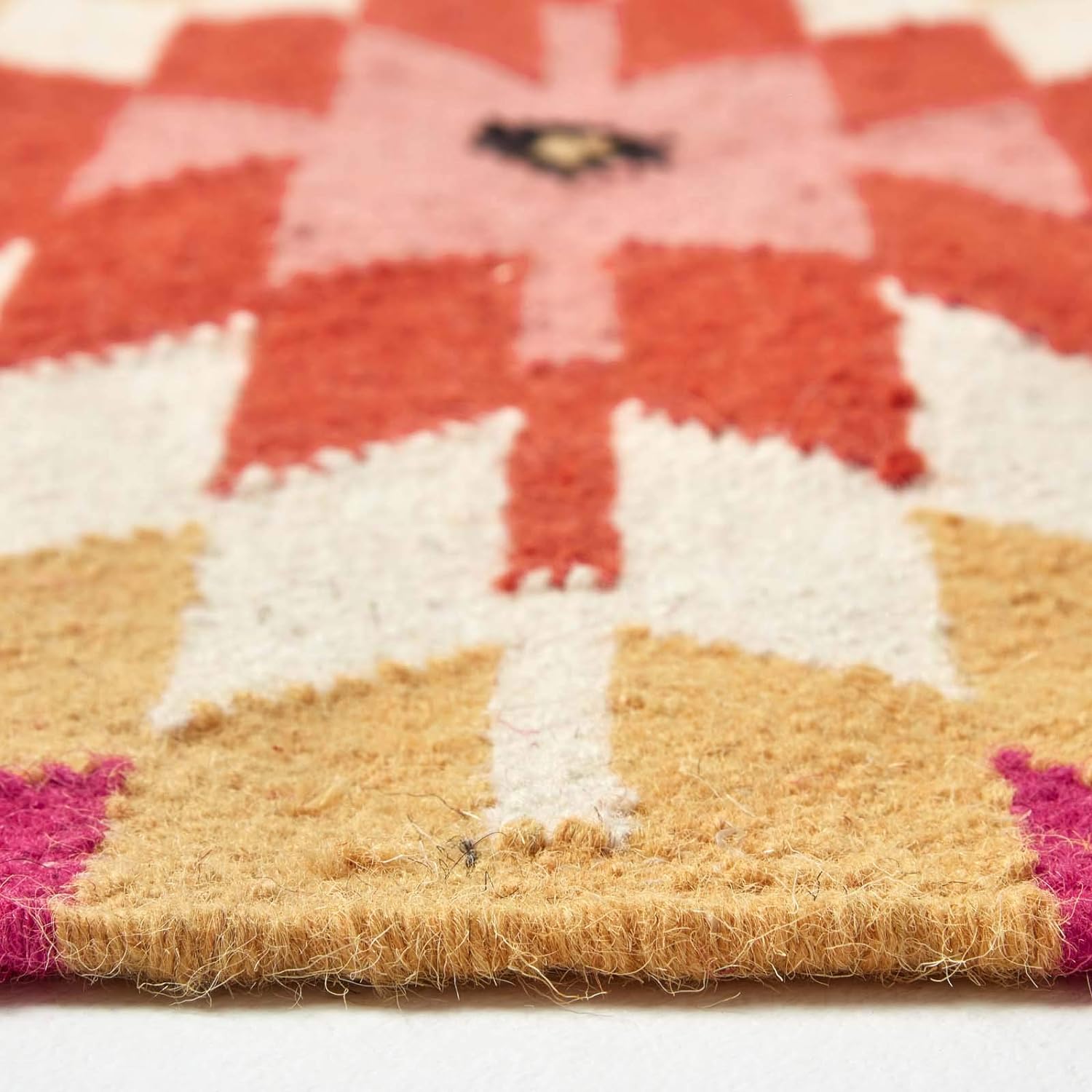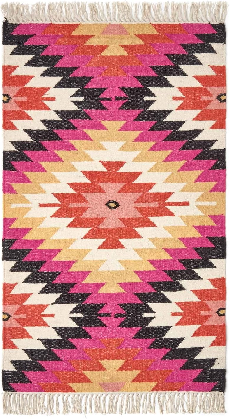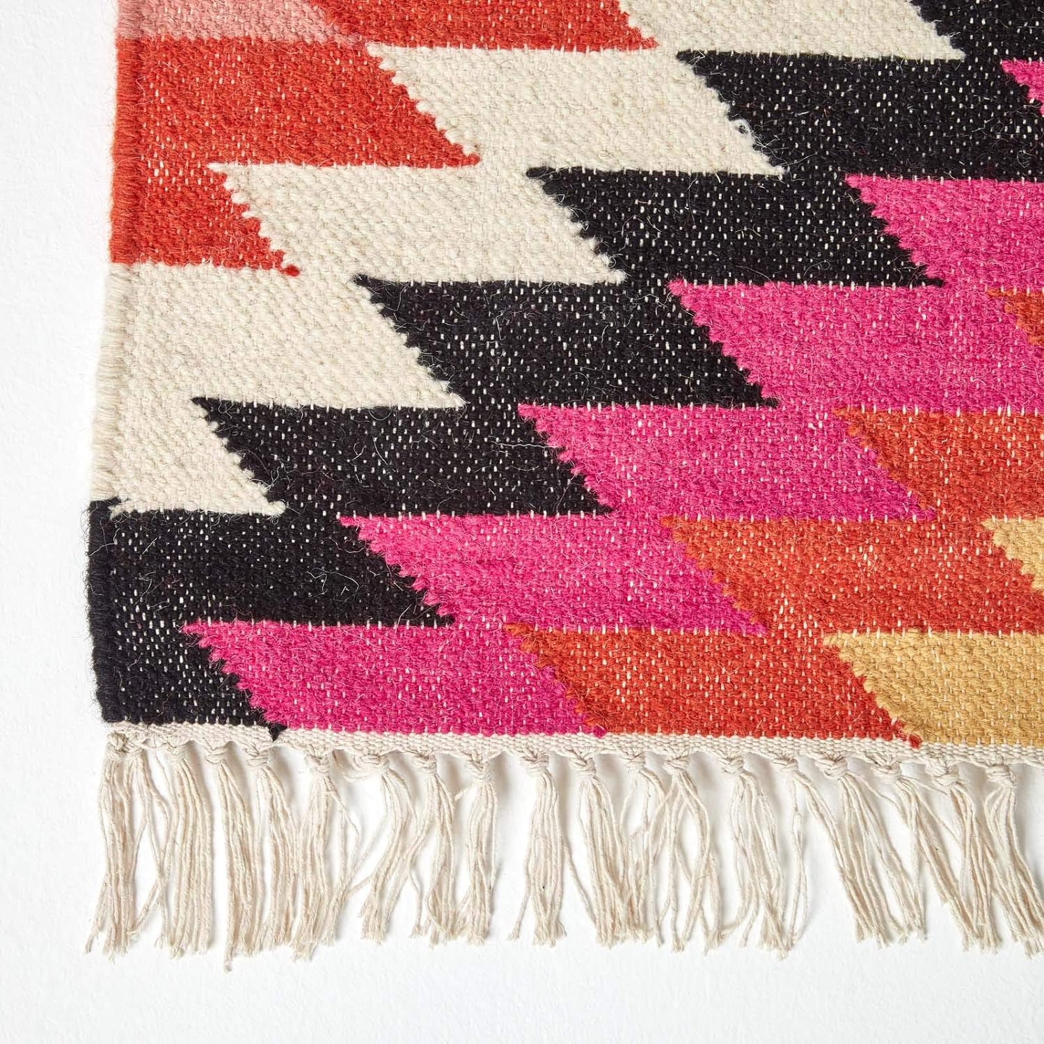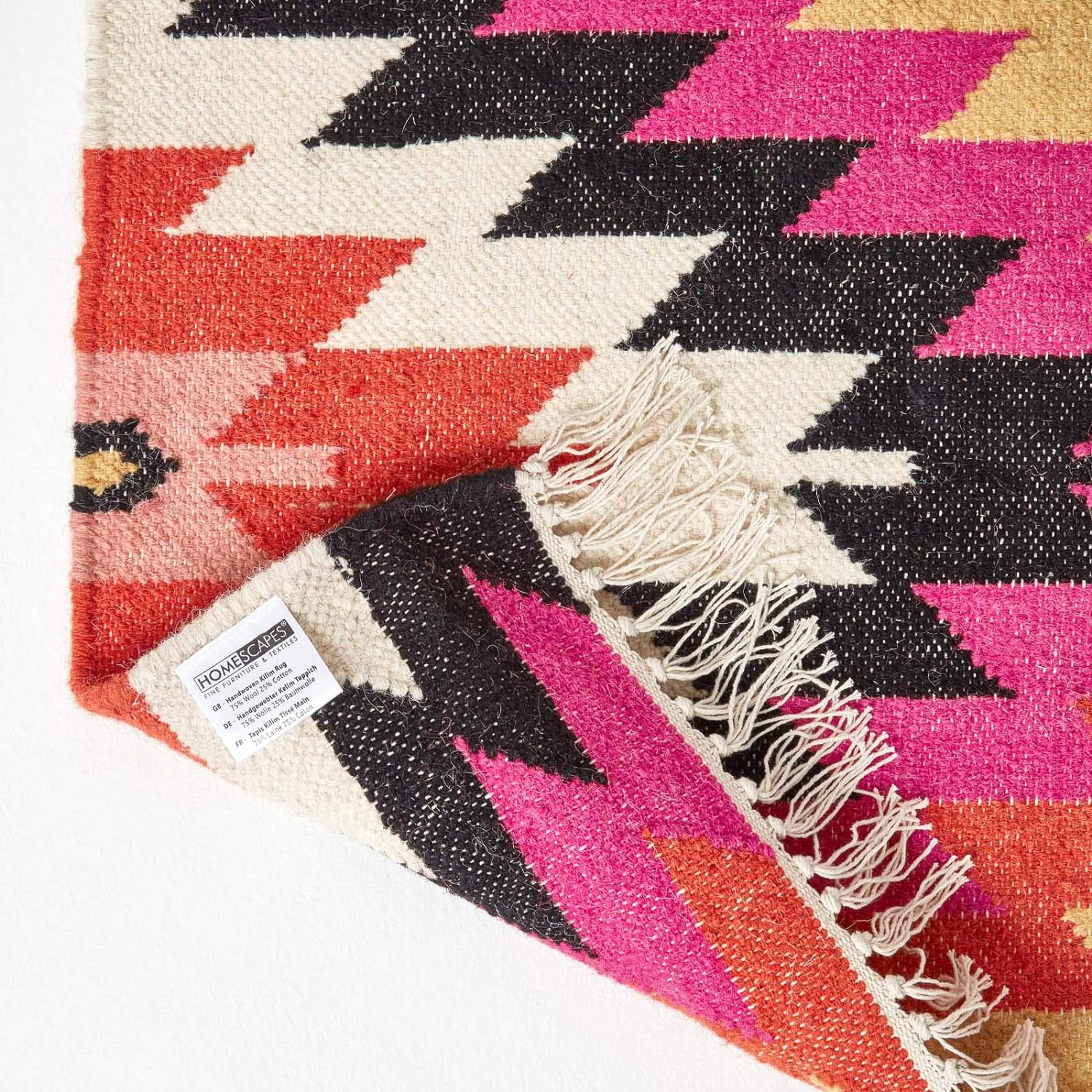 - Hochwertiger Wollteppich Jakarta mit traditionellen Mustern und verspielten Fransen. Grösse: ca. 120 x 170 cm. Mehrfarbig: pink, orange, schwarz, gelb, rot.