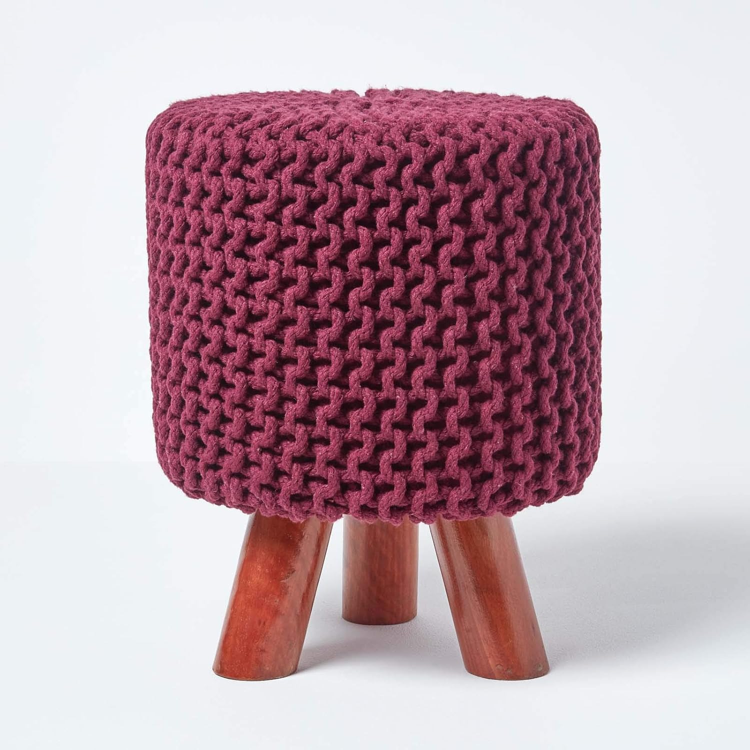 - Kleiner Strickhocker mit Grobstrick-Optik und drei Holzbeinen. Grösse: ca. L32 x B32 x H42 cm. Farbe: Pflaume