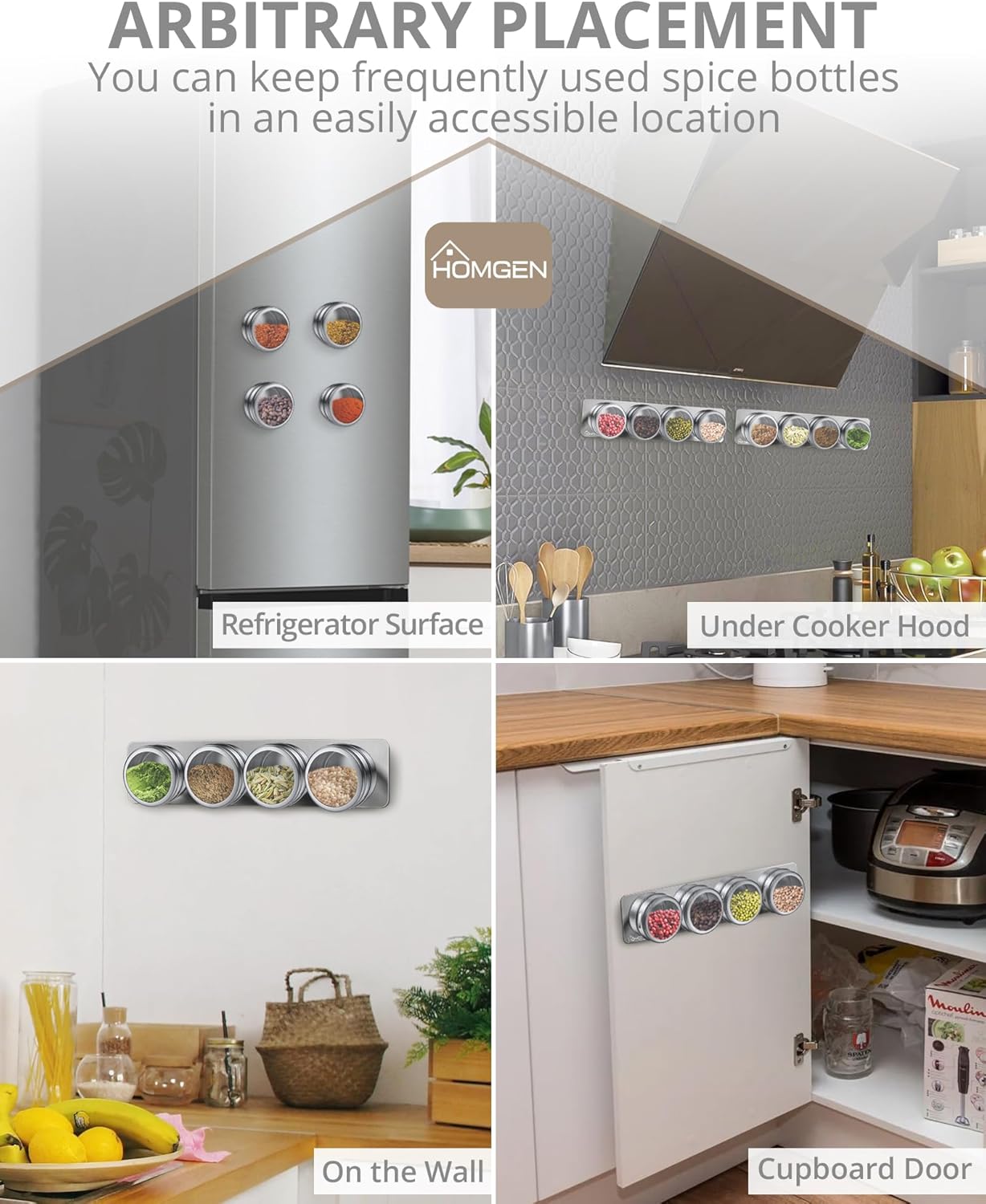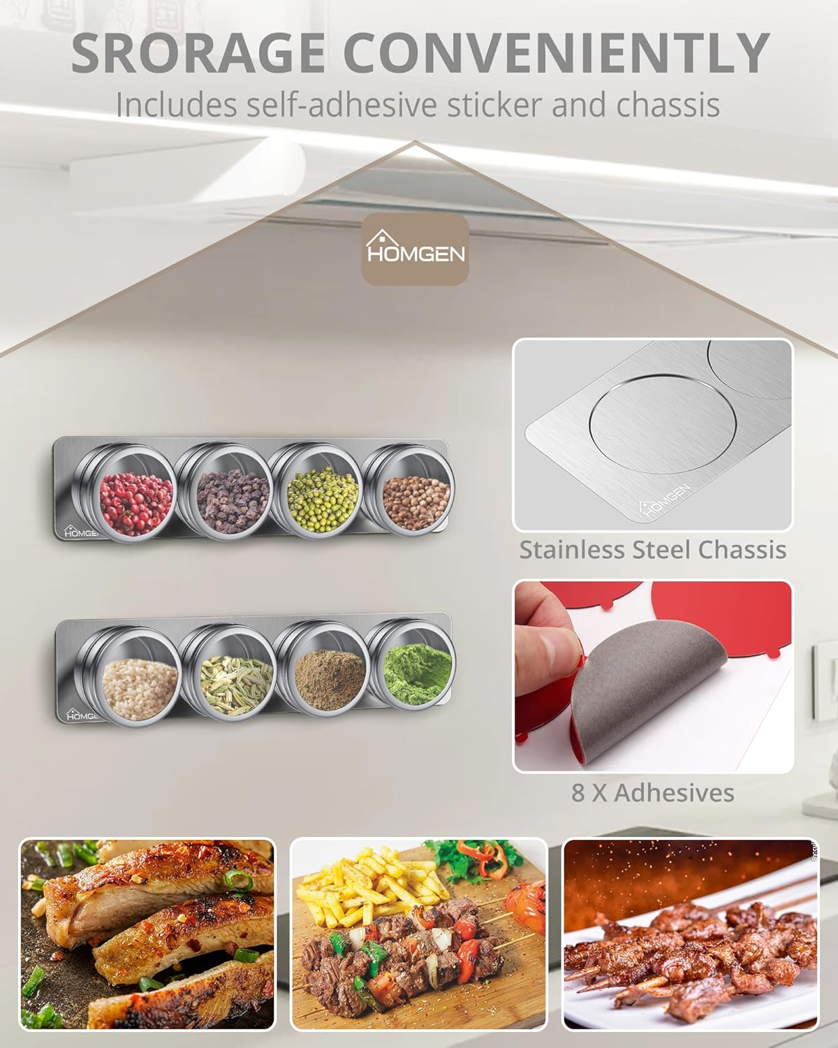 - 【Packungsinhalt】HOMGEN Gewürzdosen-Set enthält 8 magnetische Gewürzdosen, 2 Edelstahlböden, 5 Gewürzetiketten und 12 selbstklebende Klebeblätter. (Hinweis: Edelstahl-Bodenschale ist scharf, bitte mit Vorsicht verwenden)