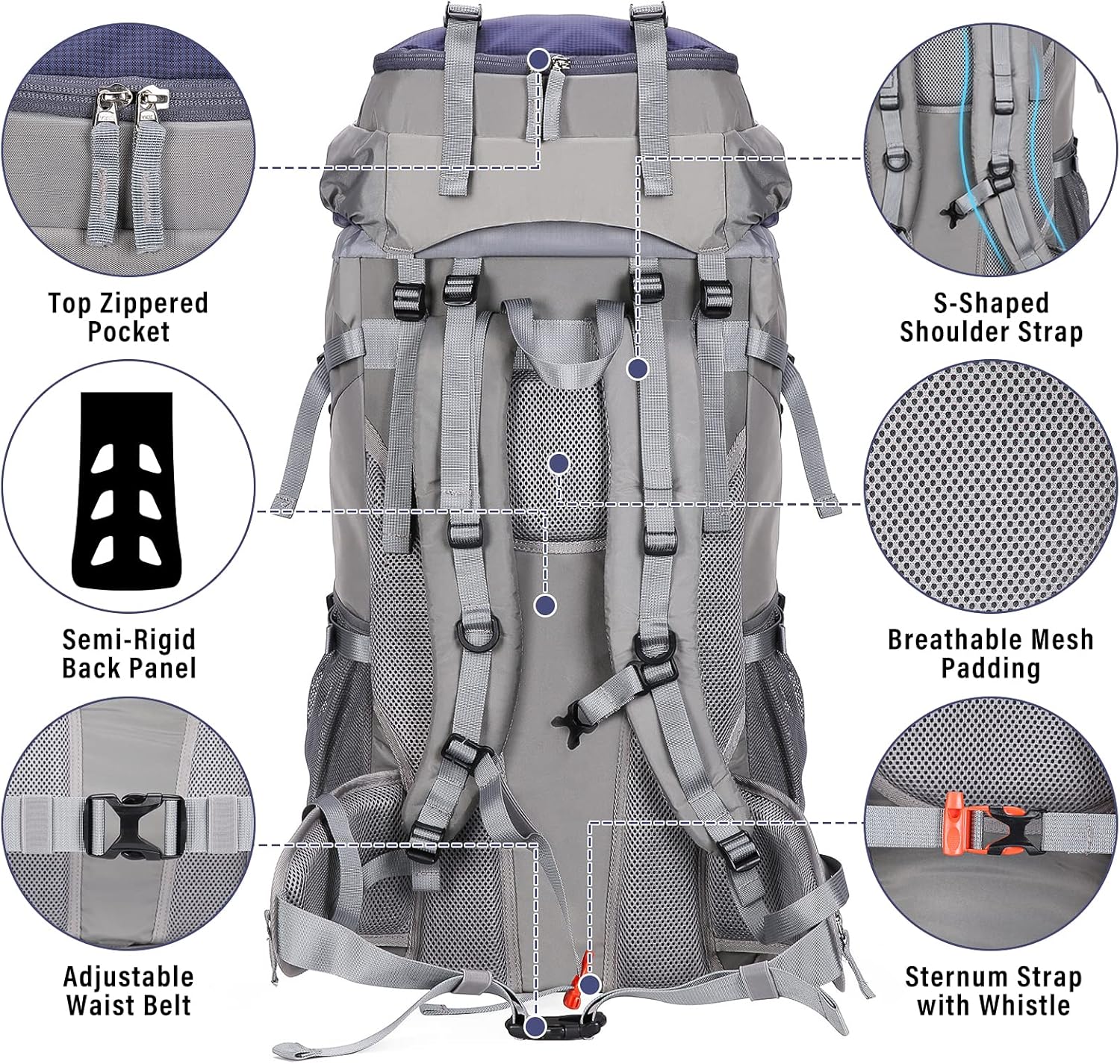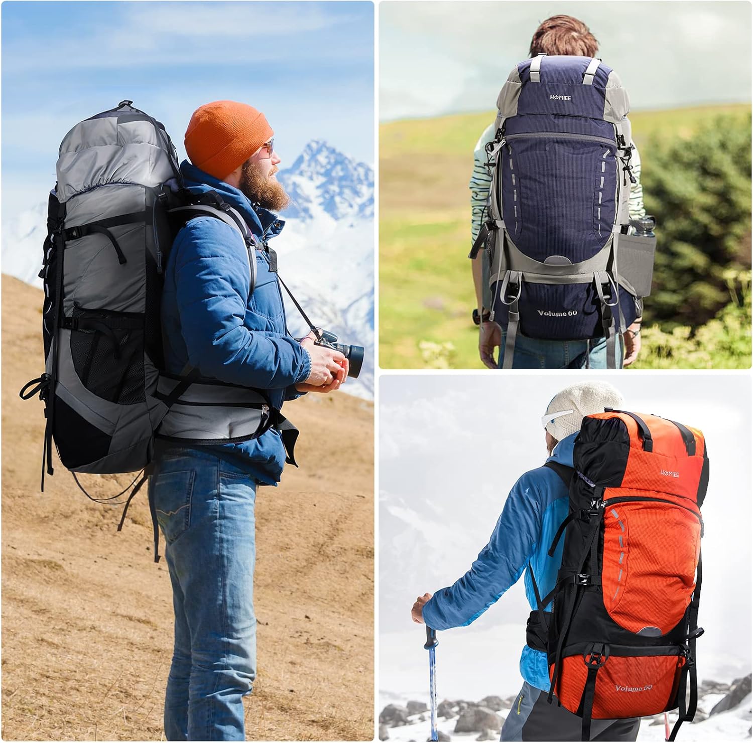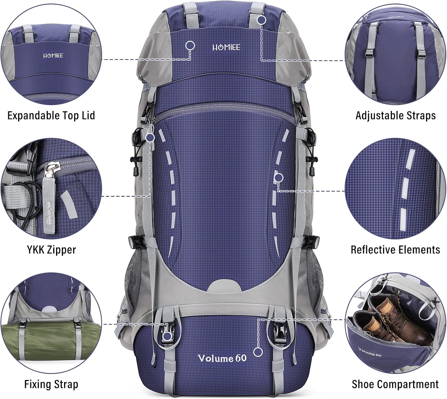- 【60L GROssE KAPAZITÄT】HOMIEE Wanderrucksack Design mit 60L grosser Kapazität. In mehreren Taschen können verschiedene Gegenstände aufbewahrt werden: Kleidung, Regenschirme, Tassen, Schnelltrocknendes Handtuch, Kissen, andere Kochutensilien usw.
