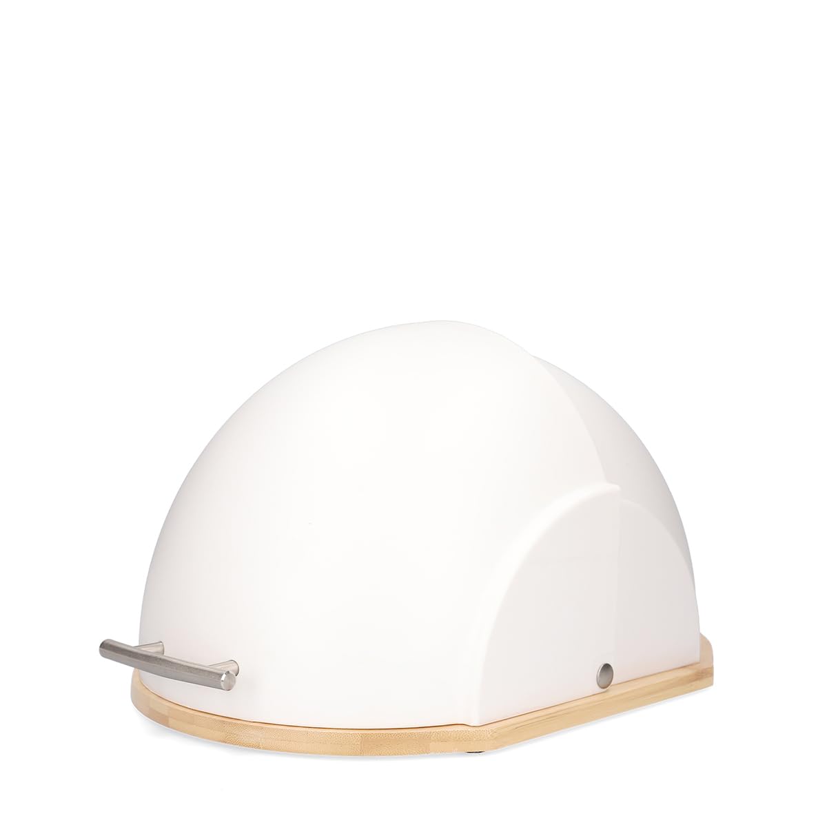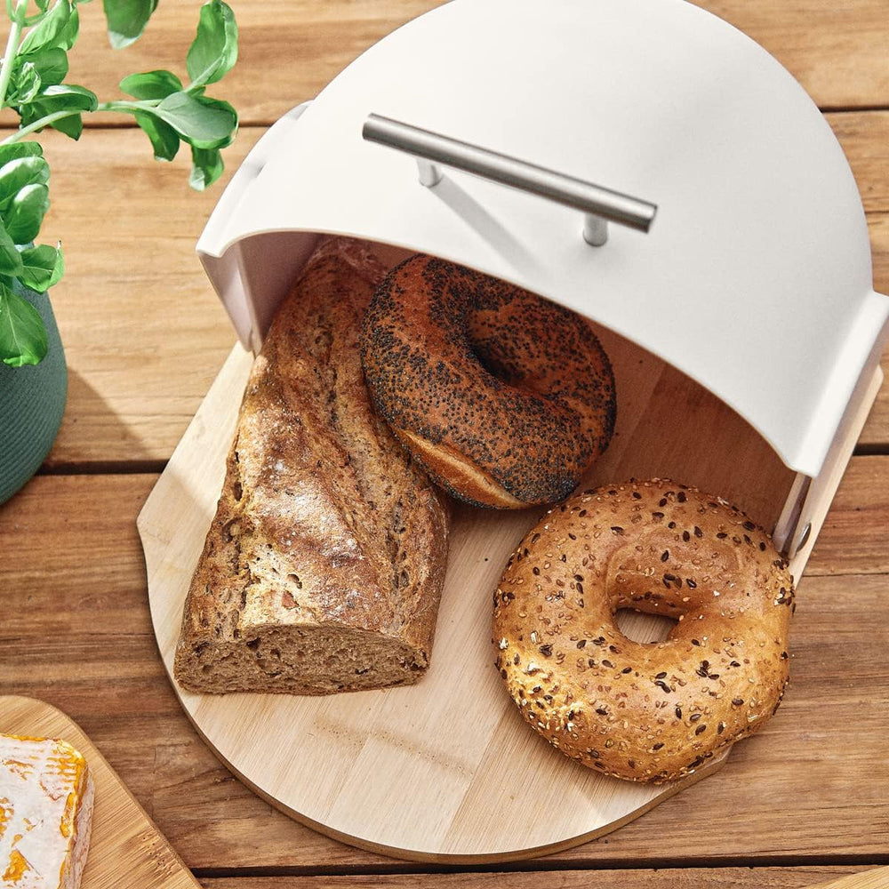 - 🍞 MODERNES DESIGN: Das Design des Brotkastens ist ästhetisch und dennoch unkonventionell. Ein halbkreisförmiger Deckel ruht auf einem stabilen Bambusbrett, was für ein interessantes Farb- und Materialspiel sorgt. Er ist auch eine tolle Küchen Deko.