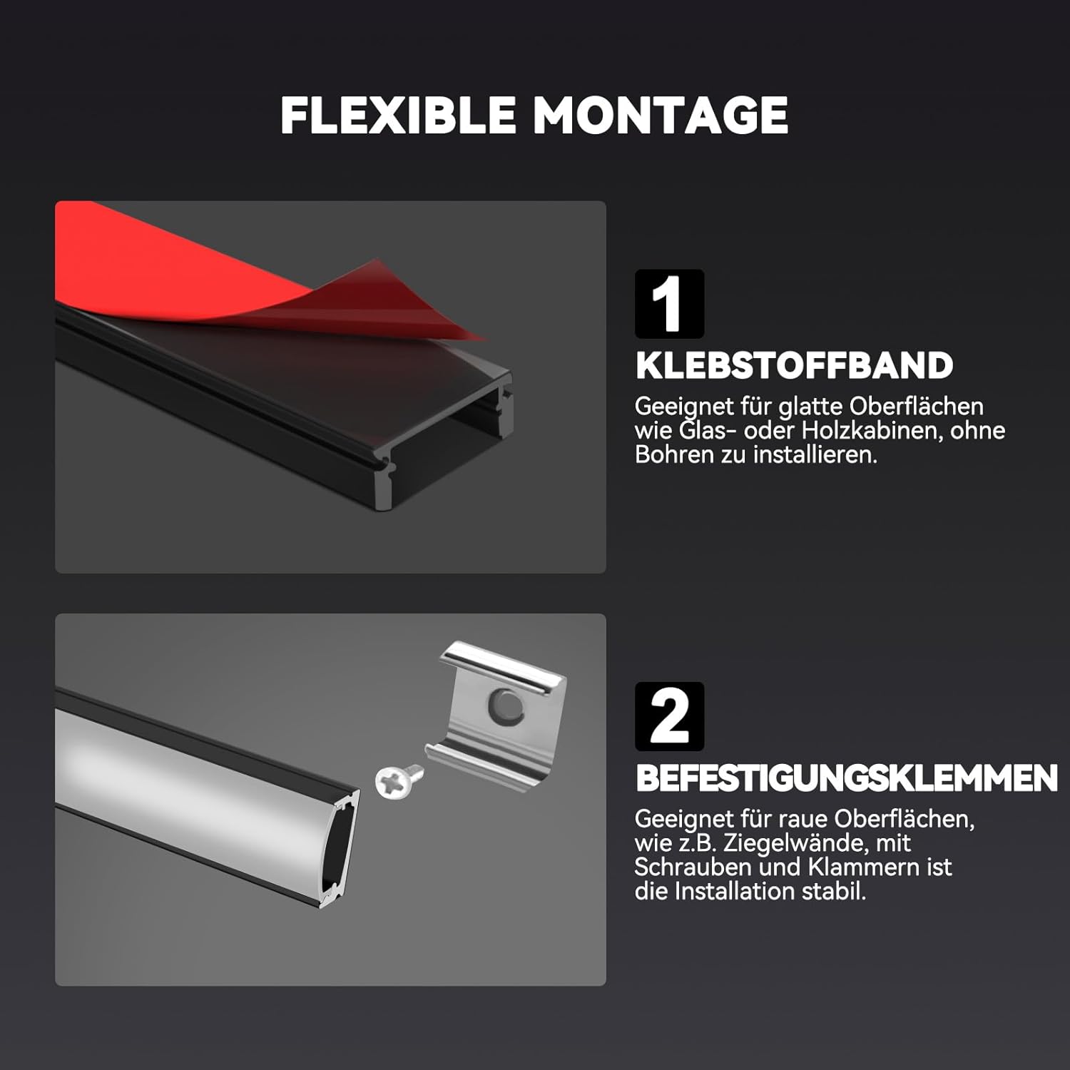 - [ Umfassende Einsatzmöglichkeiten ] - Äusserst vielseitig und sowohl für eingelassene als auch für oberflächenmontierte LED profil indirekte beleuchtung geeignet. Alle Arten von 1-10mm LED Streifen können montiert werden. Mit den leicht zu