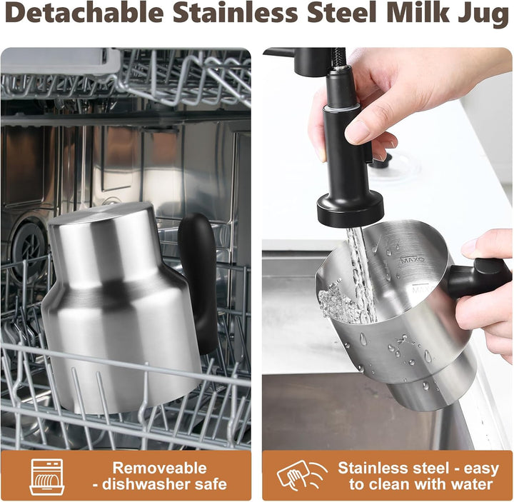 - 【Abnehmbarer Edelstahlkrug】Der Milchaufschäumer besteht aus langlebigem, qualitativ hochwertigem Edelstahl in Lebensmittelqualität, der sowohl sicher zu verwenden als auch bequem zu reinigen ist. Sie können ihn direkt unter Wasser abspülen oder