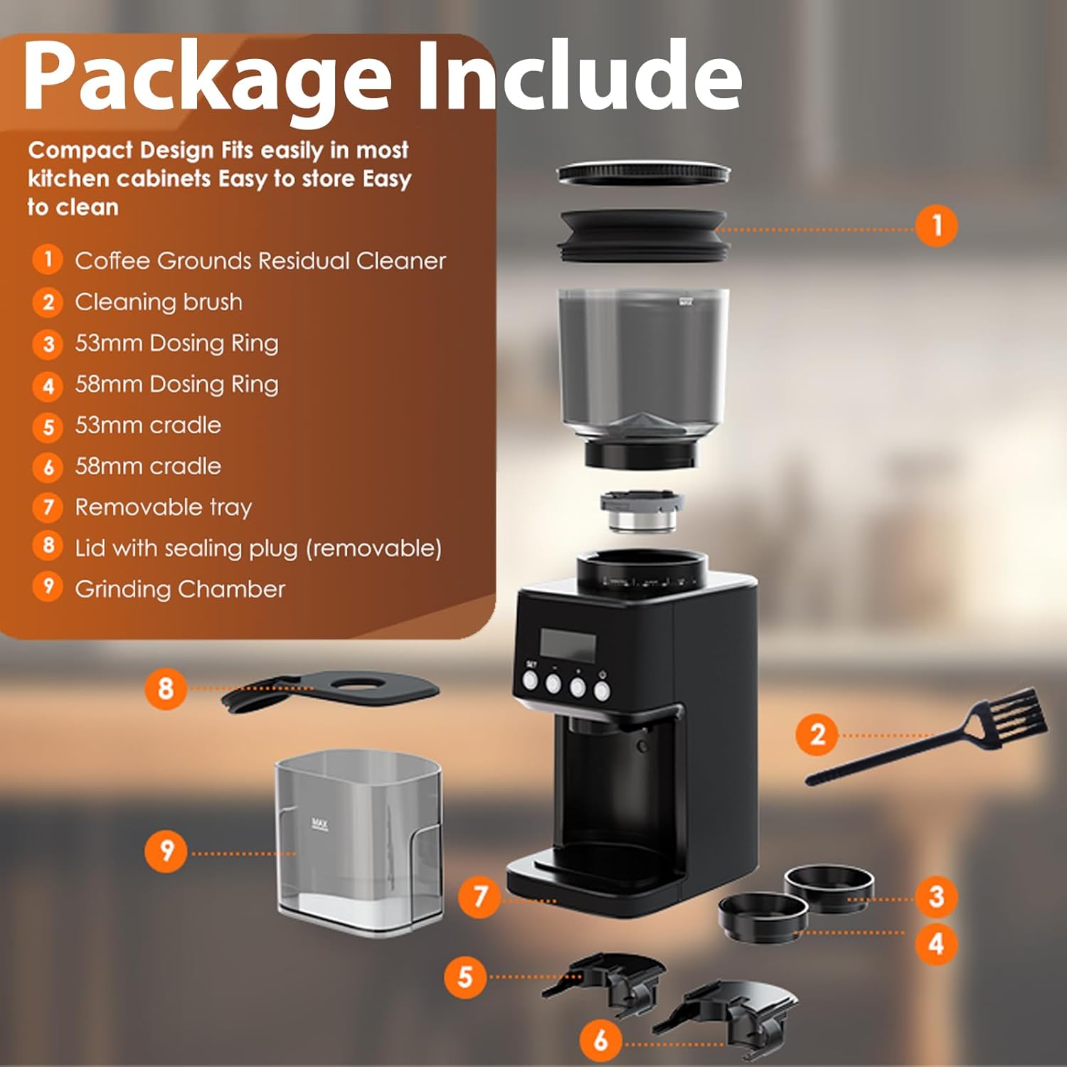 - [𝗞𝗢𝗠𝗣𝗔𝗞𝗧 𝗨𝗡𝗗 𝗞𝗢𝗠𝗣𝗟𝗘𝗧𝗧] Mit den Massen 12x16x34,5 cm verfügt diese Espressomühle über einen 270 g fassenden Bohnenbehälter und ein 150 g grosses Auffanggefäss für das Mahlgut. Enthalten sind 58
