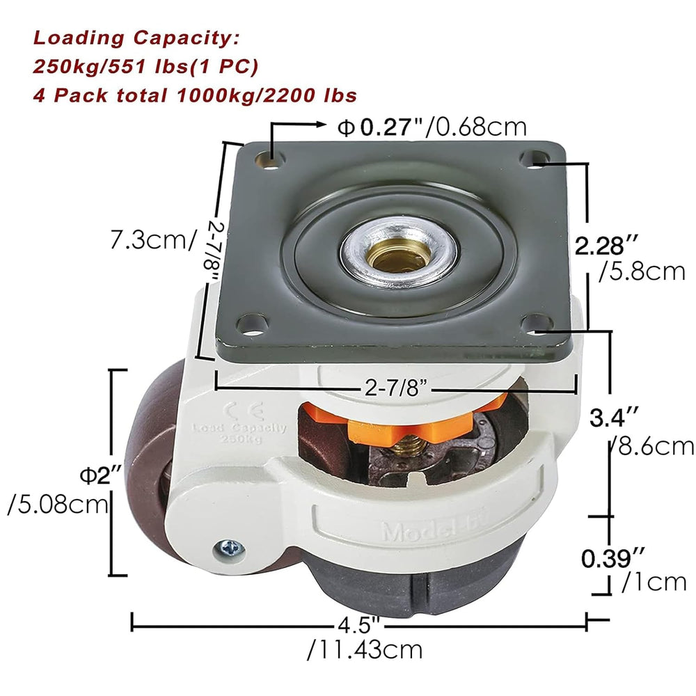 - GRÖSSEN: Die Nivellierrollen sind aus hochbelastbarem Metall gefertigt, mit einem verschleissfesten Nylonrad und einer langlebigen Gummiauflage, obere Platte ist 7,3 x 7,3 cm, Bolzenlöcher 5,79 x 5,79 cm, Raddurchmesser 5 cm. Nivelliermass 0,99 cm.
