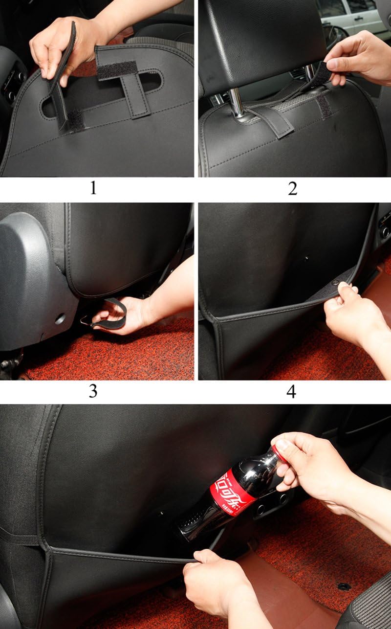 - 【Einfach zu installieren】 Öffnen Sie den Klettverschluss, befestigen Sie ihn unter der Kopfstütze und schnallen Sie die unteren Haken an der Sitzfläche an. Die Trittmatte bleibt an ihrem Platz und rutscht nicht vom Autositz.