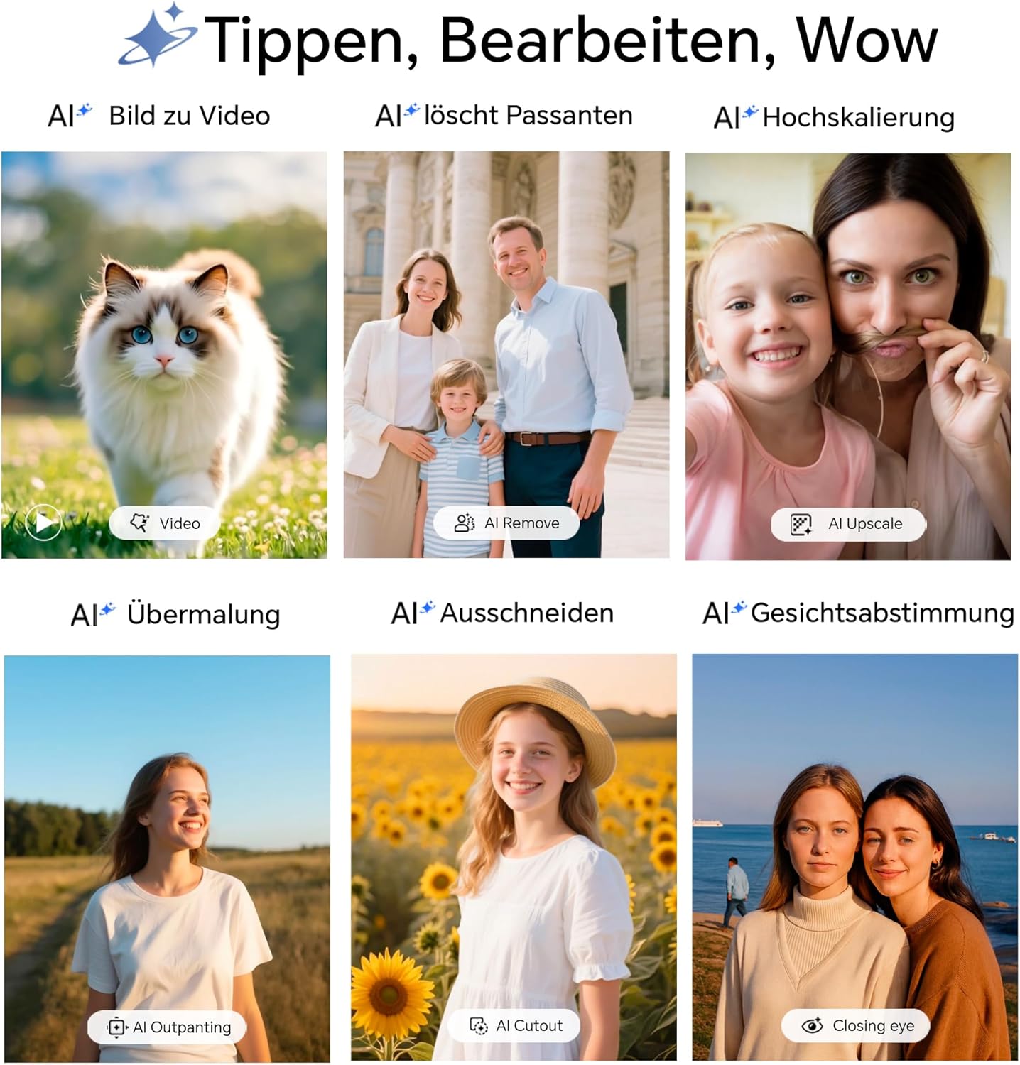 - 【KI-gestützte Kreativtools】- Bearbeiten Sie Fotos/Videos mit KI-Tools: „Reflexionsentfernung“, „Deepfake-Erkennung“, „Magic Portal“ (Bild-zu-Video) und „Gesichtsoptimierung“ (perfekte Gruppenfotos). Nutzen Sie KI-Untertitel für