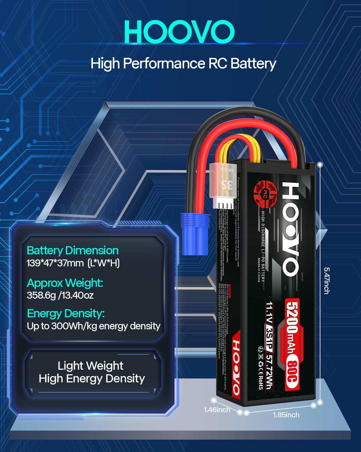 - 【Verpackung und Kundendienst】 2 * HOOVO 3S 5200 mAh 80C HardCase mit EC5 Stecker Lipo-Batterien; 1 * Benutzerhandbuch. HOOVO-Batterien erfüllen die RoHS- und CE-Qualitätsstandards. Wenn Sie Fragen haben, können Sie uns gerne über Ihr