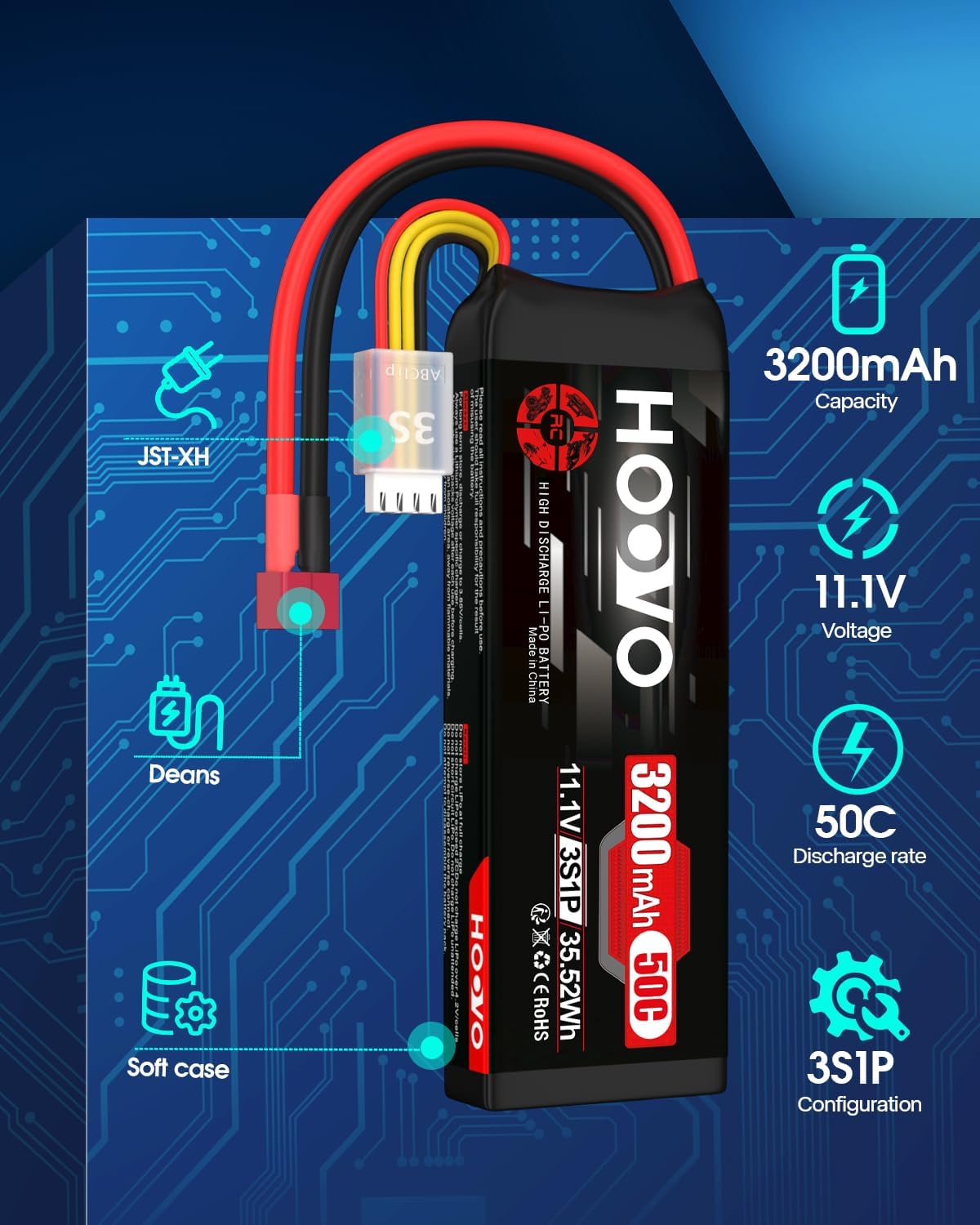 - 【Verpackung und Kundendienst】 2 * HOOVO 3S 3200 mAh 50 C SoftCase mit Deans T-Anschluss Lipo-Batterien; 1 * Benutzerhandbuch. HOOVO-Batterien erfüllen die RoHS- und CE-Qualitätsstandards. Wenn Sie Fragen haben, können Sie uns gerne über Ihr