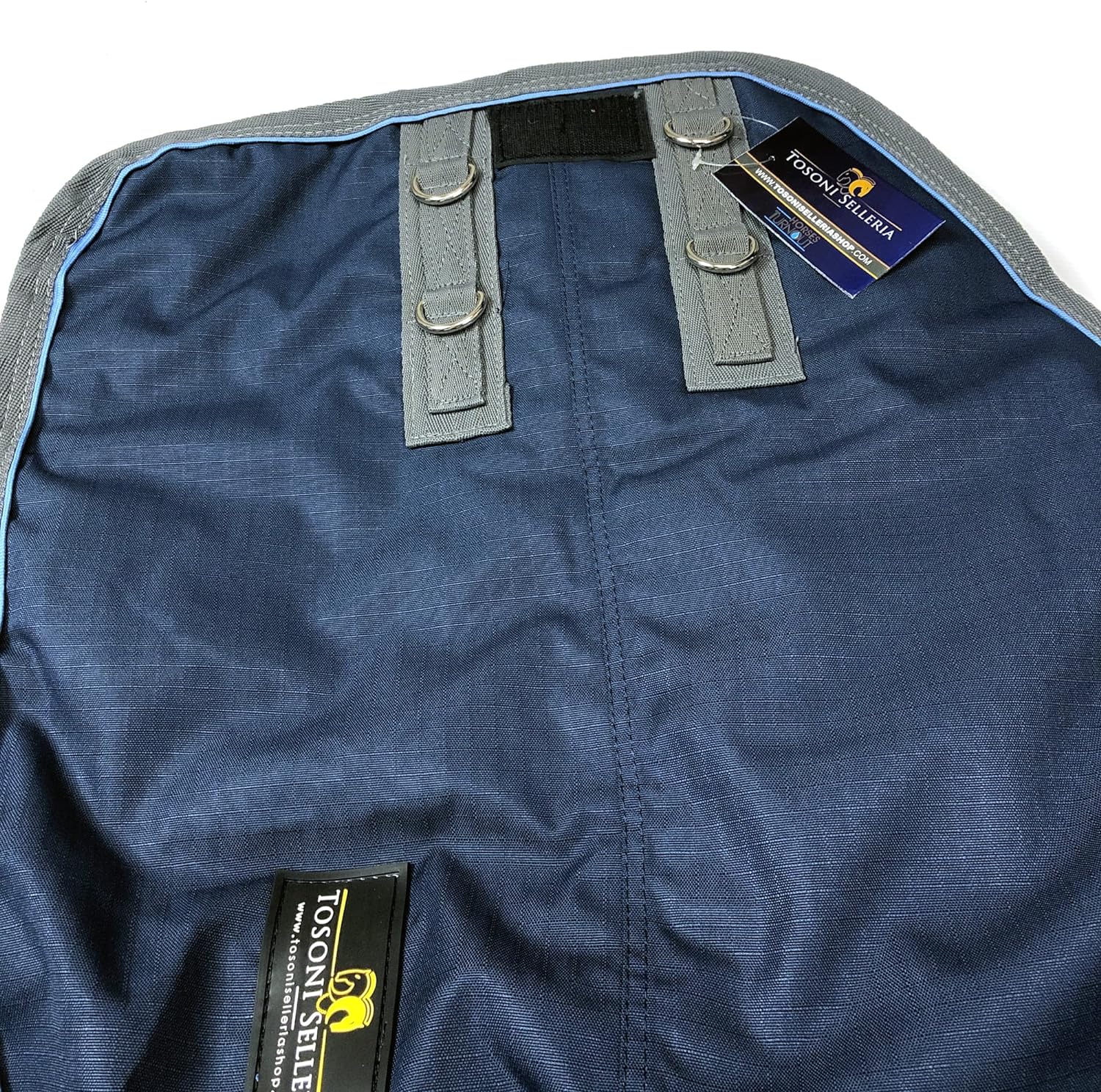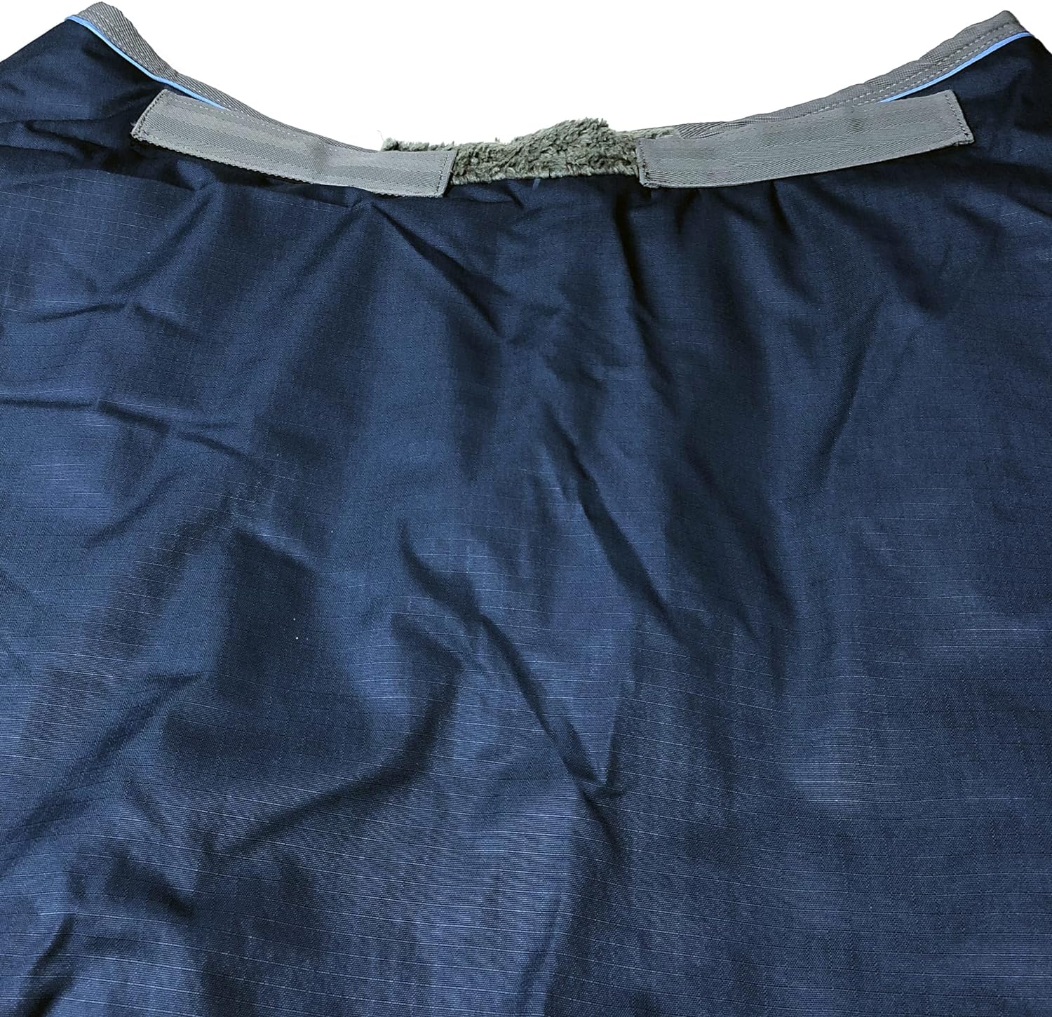 - Einsätze und Verzierungen: Die Decke hat einen abnehmbaren Nackenschutz, Überkreuz- und Unterschenkelriemen, Schwanzabdeckung und Doppelverschluss mit Karabinern und Riemen. Es trägt das Horses Turnout-Logo