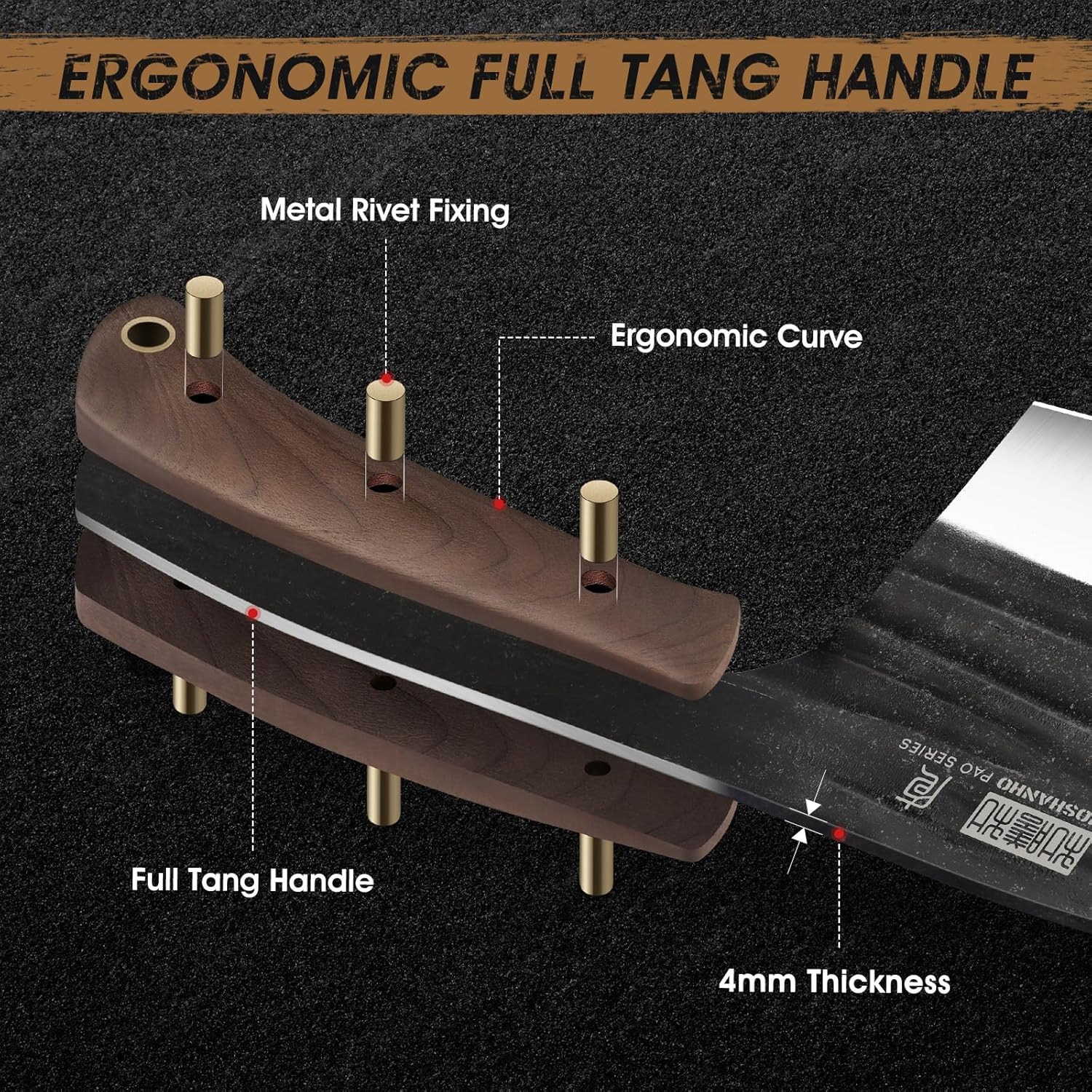 • 【Robustes Hackmesser】Der 4 mm dicke Klingenrücken ist ein Highlight dieses Knochenhackmesser. Er erhöht die Stabilität und Haltbarkeit im Gebrauch. Beim Schneiden härterer Zutaten wie Knochen wirkt der dicke Klingenrücken wie eine solide