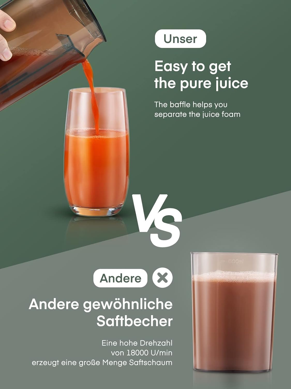 - 🍏【Eingebauter Schaumabscheider】 Der Saftkrug verfügt über einen integrierten Schaumabscheider, um mehr Saft in das Glas zu giessen und so Verstopfungen und Schaumbildung zu reduzieren. Das Sieb ist aus Edelstahl gefertigt, sodass es auch beim Entsaften von hartem Gemüse wie Karotten scharf bleibt.