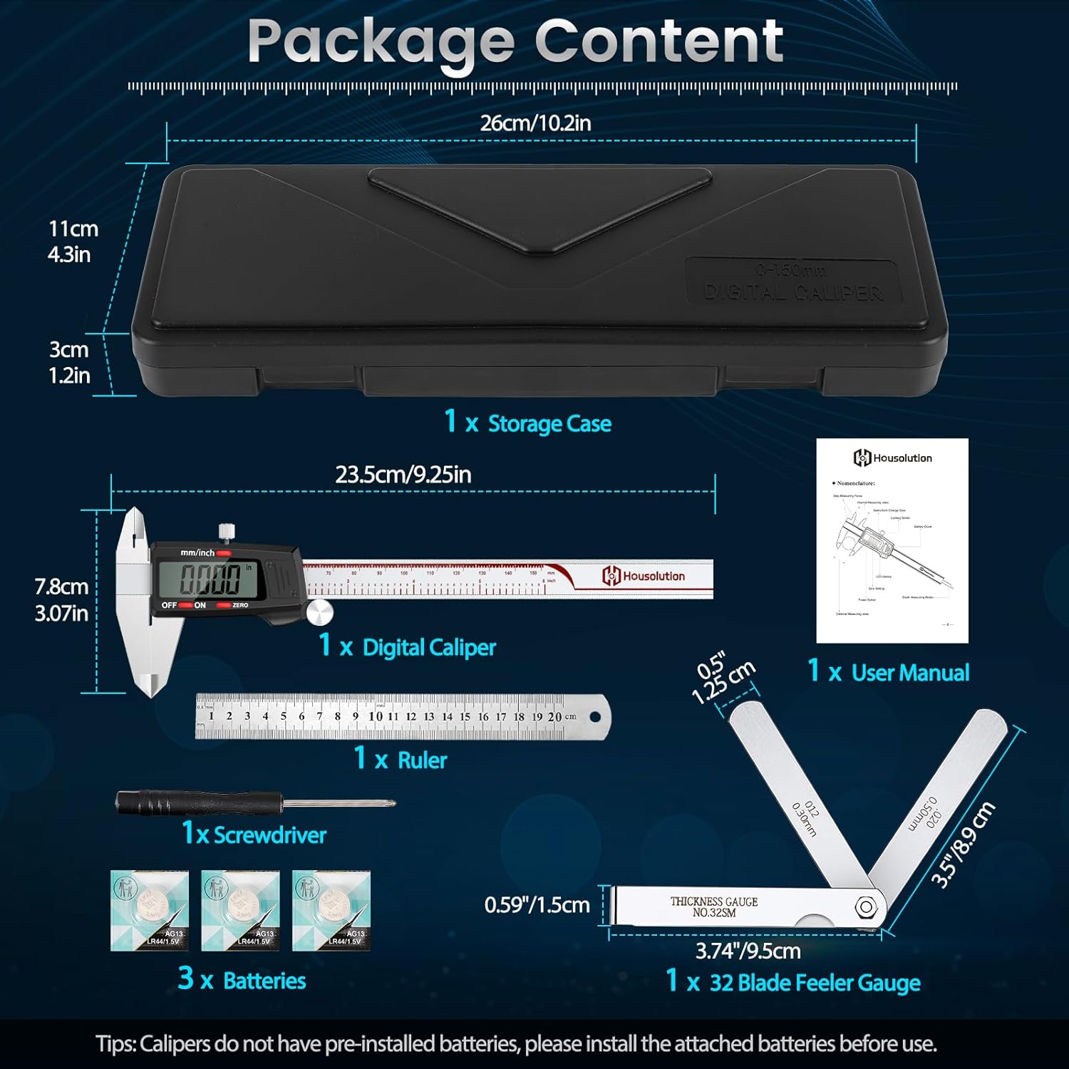 - 4 Messarten: Digitaler Messschieber hat 4 Messarten, messen Tiefe, Schritt, OD und ID durch konfigurierte 2 Sätze von Backen und Sonden, passt für mehr Nutzungsszenarien und bringt reibungslosen Messprozess. Mit 32 Stück Stahl Stecker Lineale mit