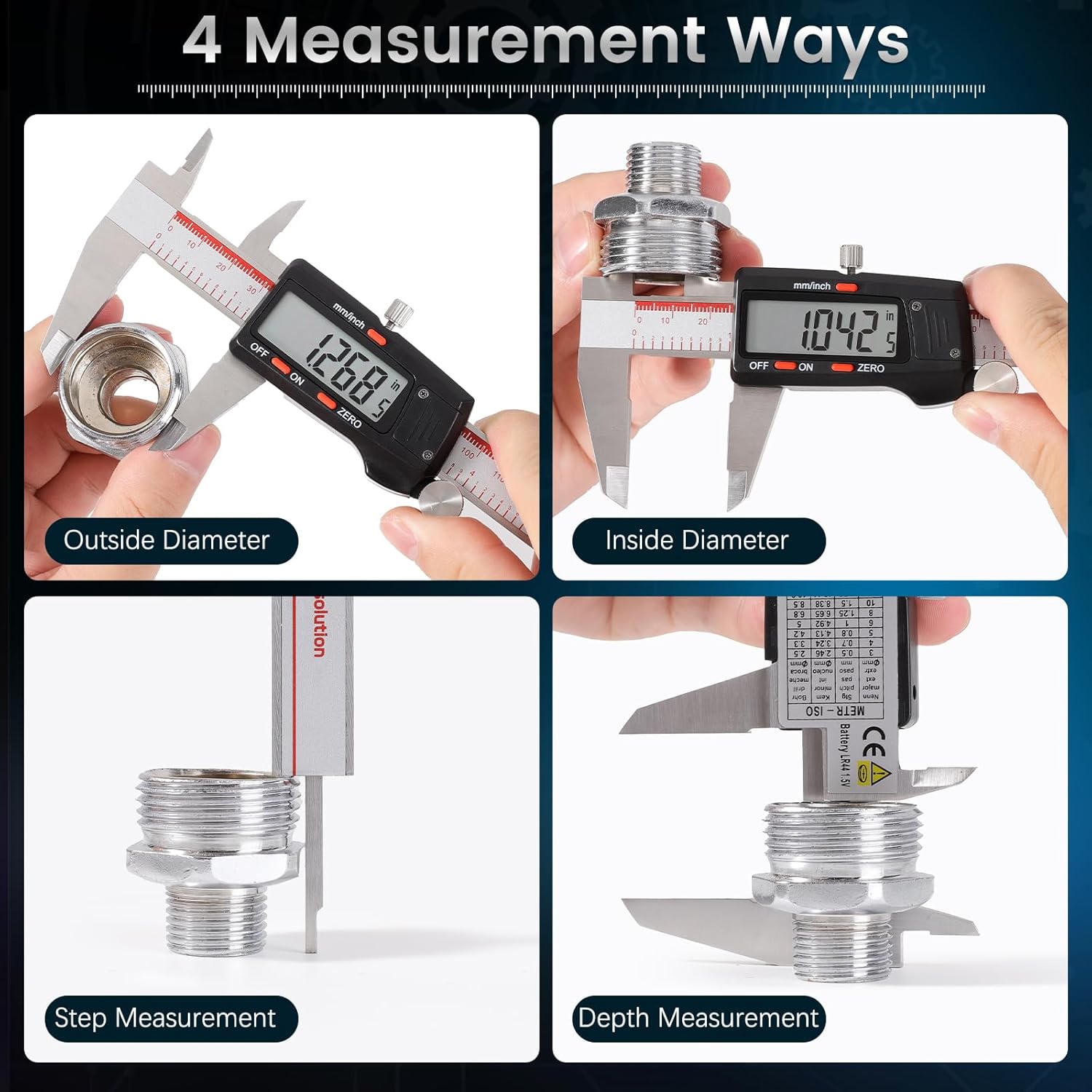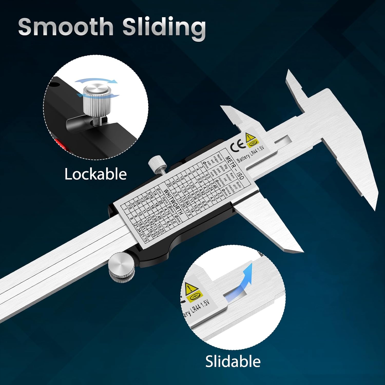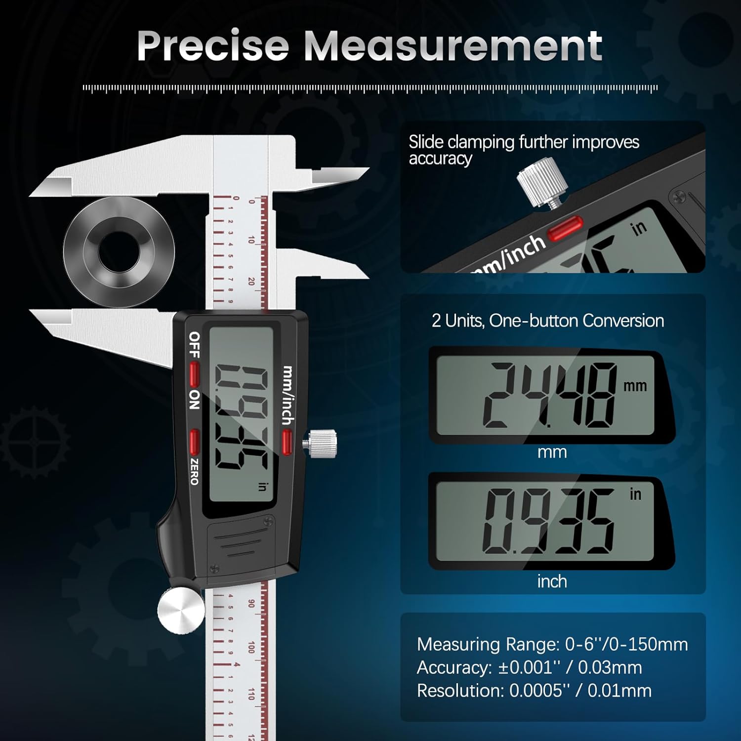 - Präzise Messung und Nullstellung: Caliper Messwerkzeug Messbereich: 0-6"/0-150mm, Genauigkeit: ±0.001" / 0.03mm, Auflösung: 0,0005" / 0,01mm, erfüllt alle Ihre Messanforderungen. Digitale Messschieber gleiten reibungslos, während das intelligente