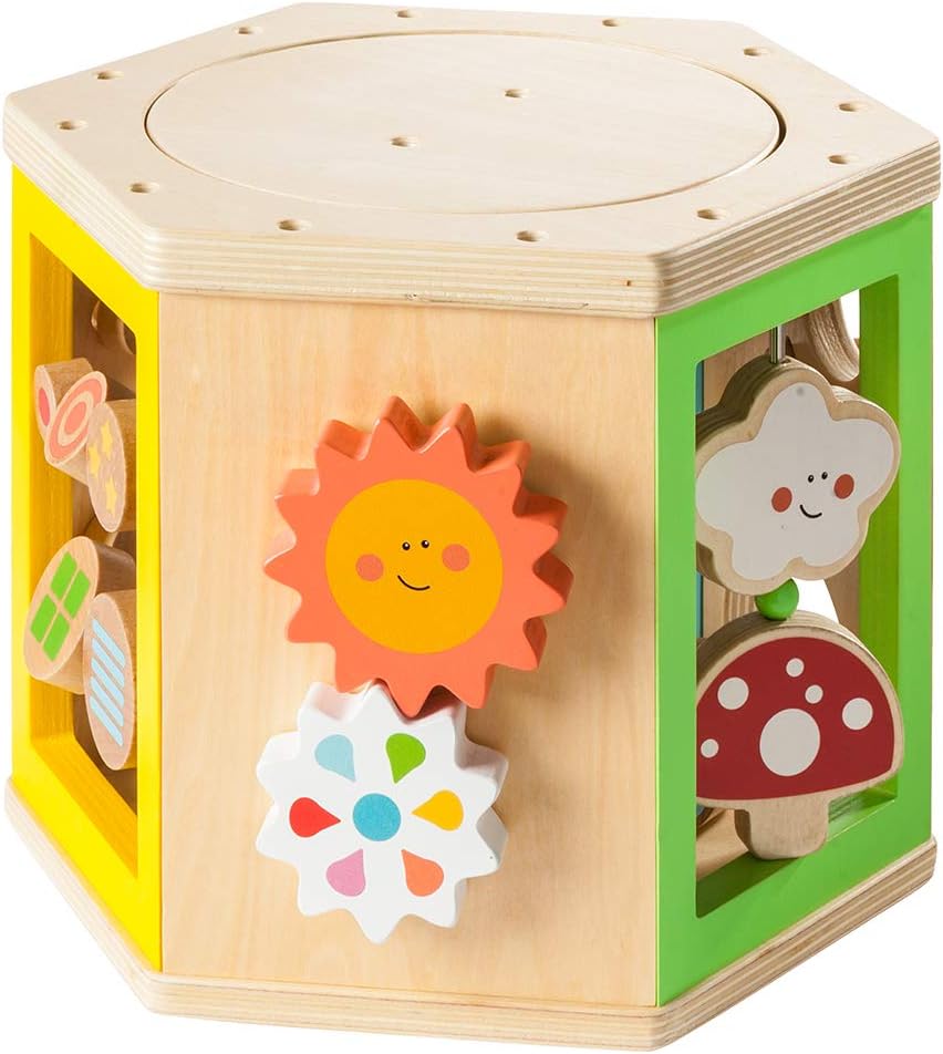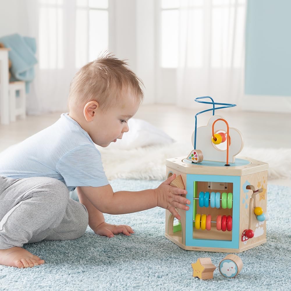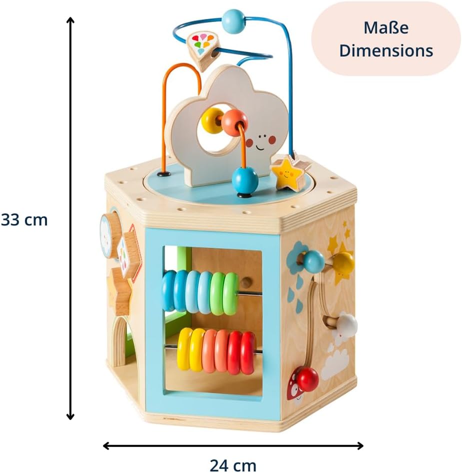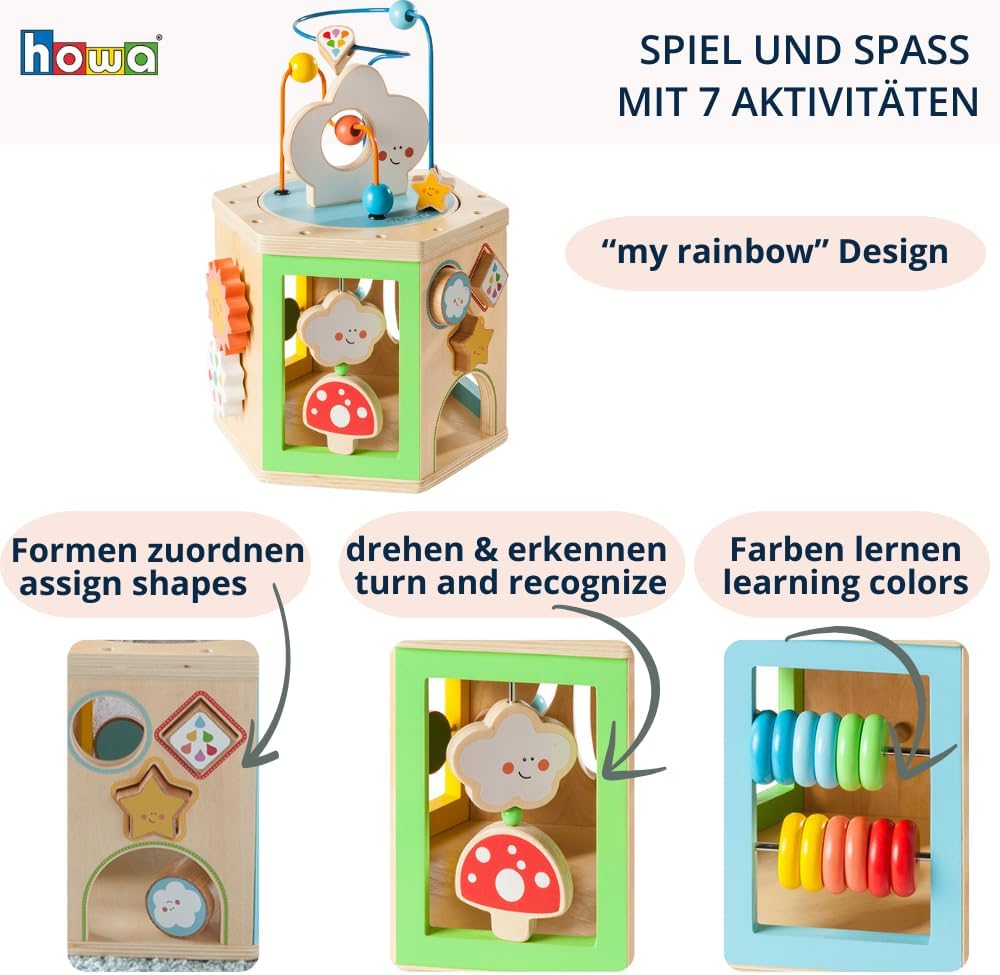 - Der Motorikwürfel jede Menge Möglichkeiten, um sich spielerisch auszutoben: Rassel, Steckwürfel, Schiebeelement zum Zuordnen von Farben, jede Menge drehbare Holzdetails und eine Motorikschleife.