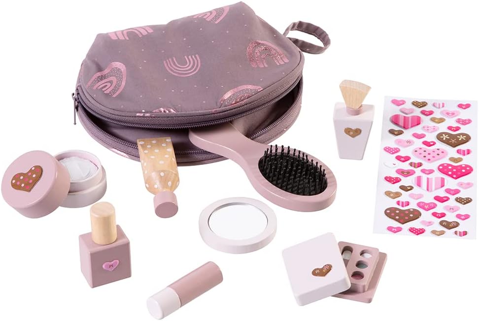 - Die Kosmetiktasche für Kinder ist gefüllt mit 8 Holzteilen wie Lippenstift, Puder, Lidschatten, Make-up Tube, Nagellack, Parfüm, Haarbürste und Handspiegel.