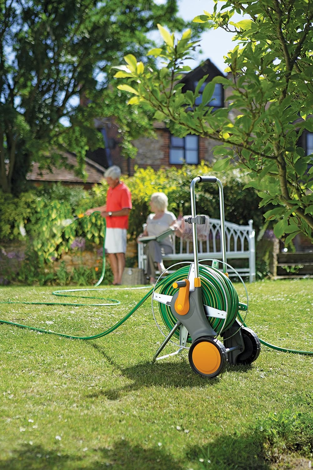 - Dieser Schlauchwagen kann bis zu 90 m Schlauch mit 12,5 mm oder 75 m Schlauch mit 15 mm Durchmesser oder 50 m Schlauch mit 19 mm Durchmesser aufnehmen (nicht im Lieferumfang enthalten).
