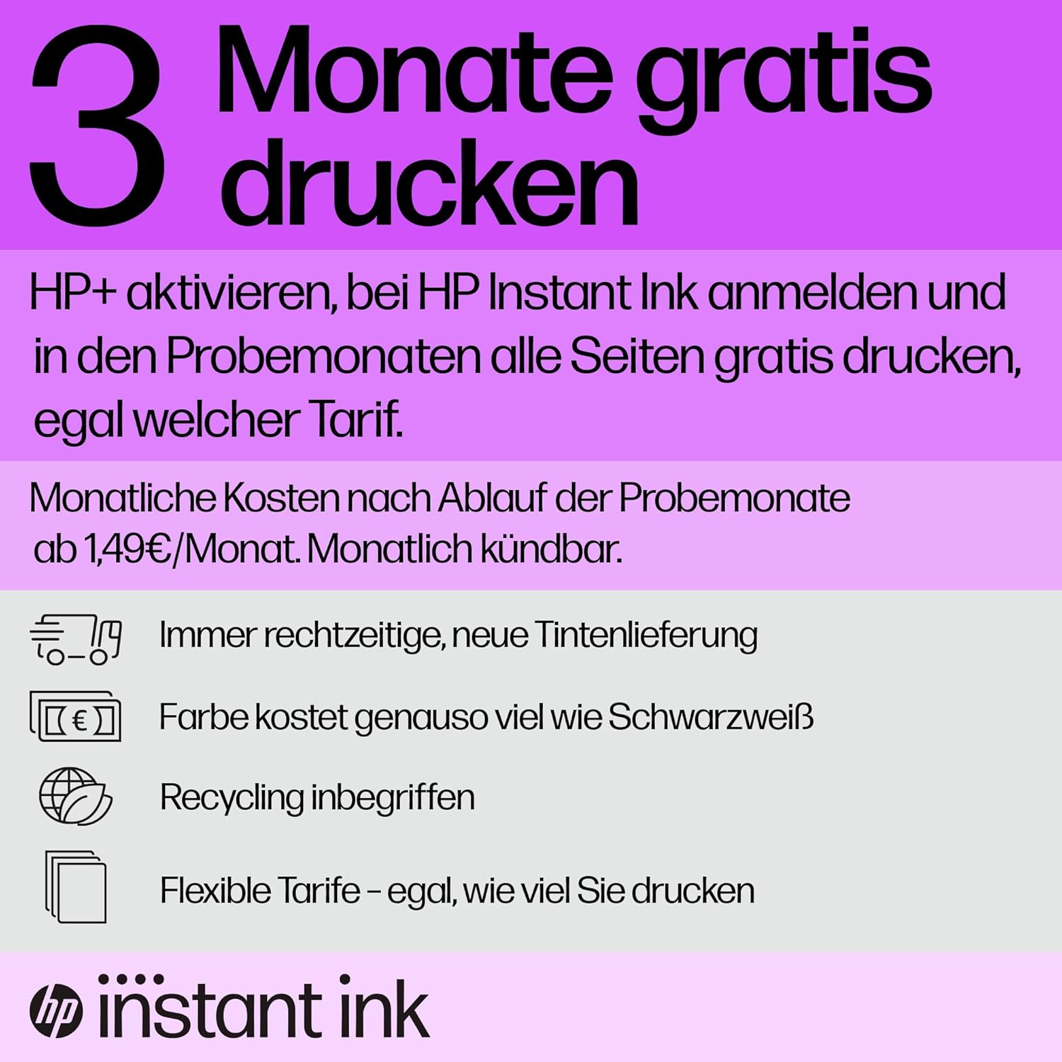 • 6 Monate Tintenlieferservice HP Instant Ink inklusive. Monatliche Kosten nach Ablauf der Probemonate ab 0,99€/Monat. Monatlich kündbar. Bei Aktivierung von HP+ während der Druckerinstallation