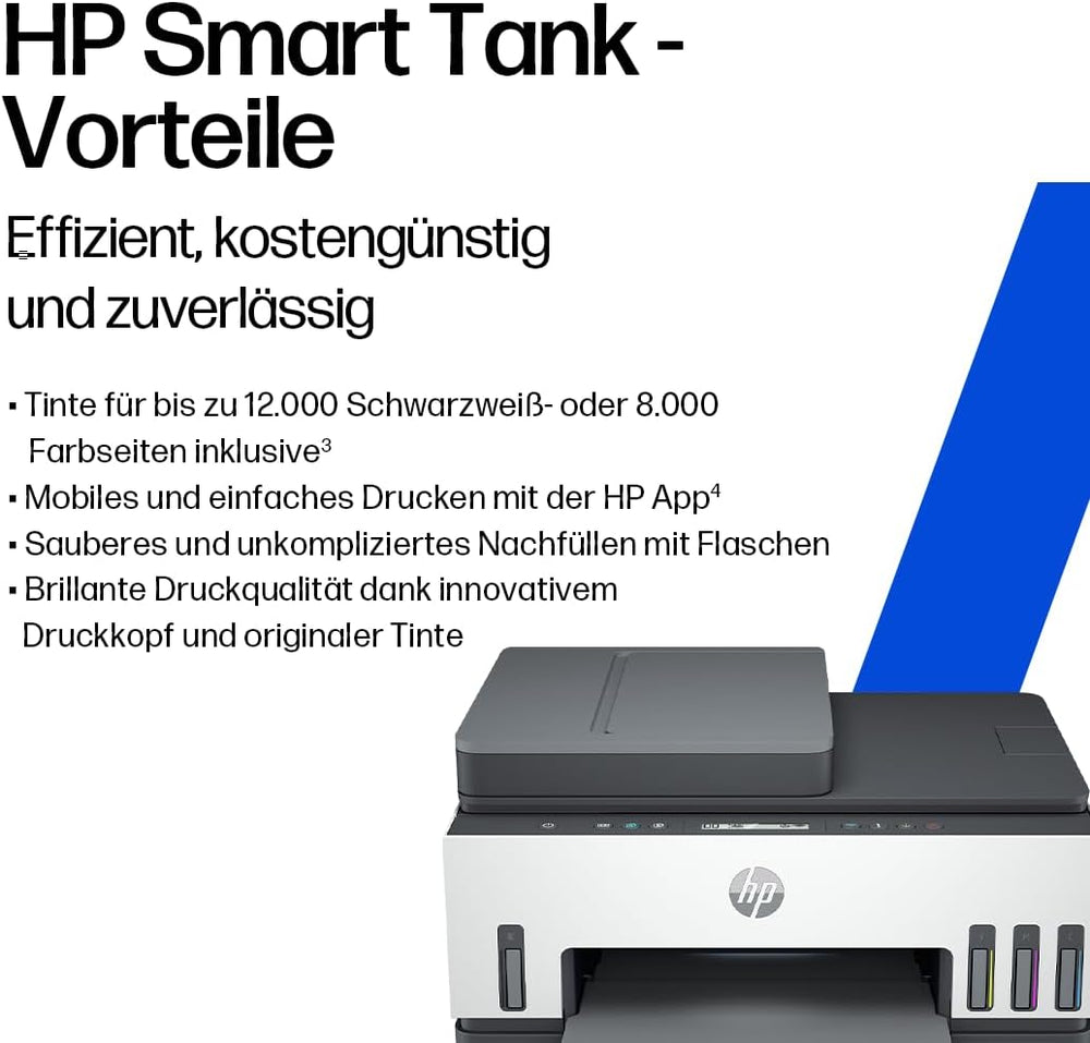 - EINFACH: Drucken ohne Druckerpatronen/-kartuschen. Einfache Einrichtung und Nachfüllen mit intelligenten Tasten und tropffreien HP-Tintentankflaschen
