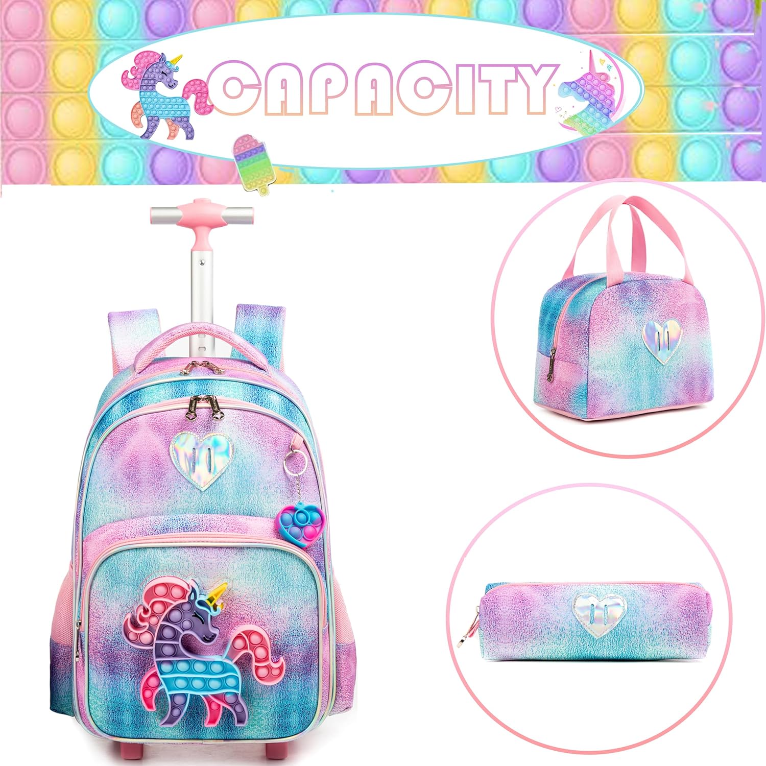 - 🦄Pop Fidget Schulranzen Mit Rollen: 43 cm x 30 cm x 19 cm, 24,5 l; Lunchpaket: 26 cm x 20 cm x 16 cm; Stifttasche: 21 cm. Diese Schultasche ist gross genug, um alle Gegenstände aufzunehmen, die Ihr Kind braucht. Geeignet für Party, Schule, Camping,