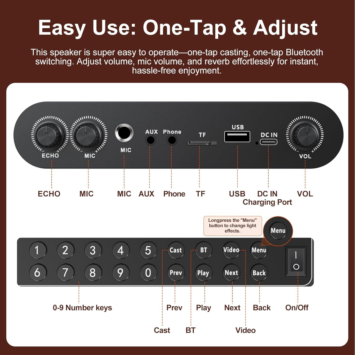 - Einfache Bedienung – Casting mit einem Klick und Fernbedienung: Geniessen Sie ein benutzerfreundliches Design mit drahtlosem Casting mit einem Klick, Bluetooth-Modusumschaltung und Schnellsteuerung für Lautstärke, Mikrofonlautstärke und Echo. Mit