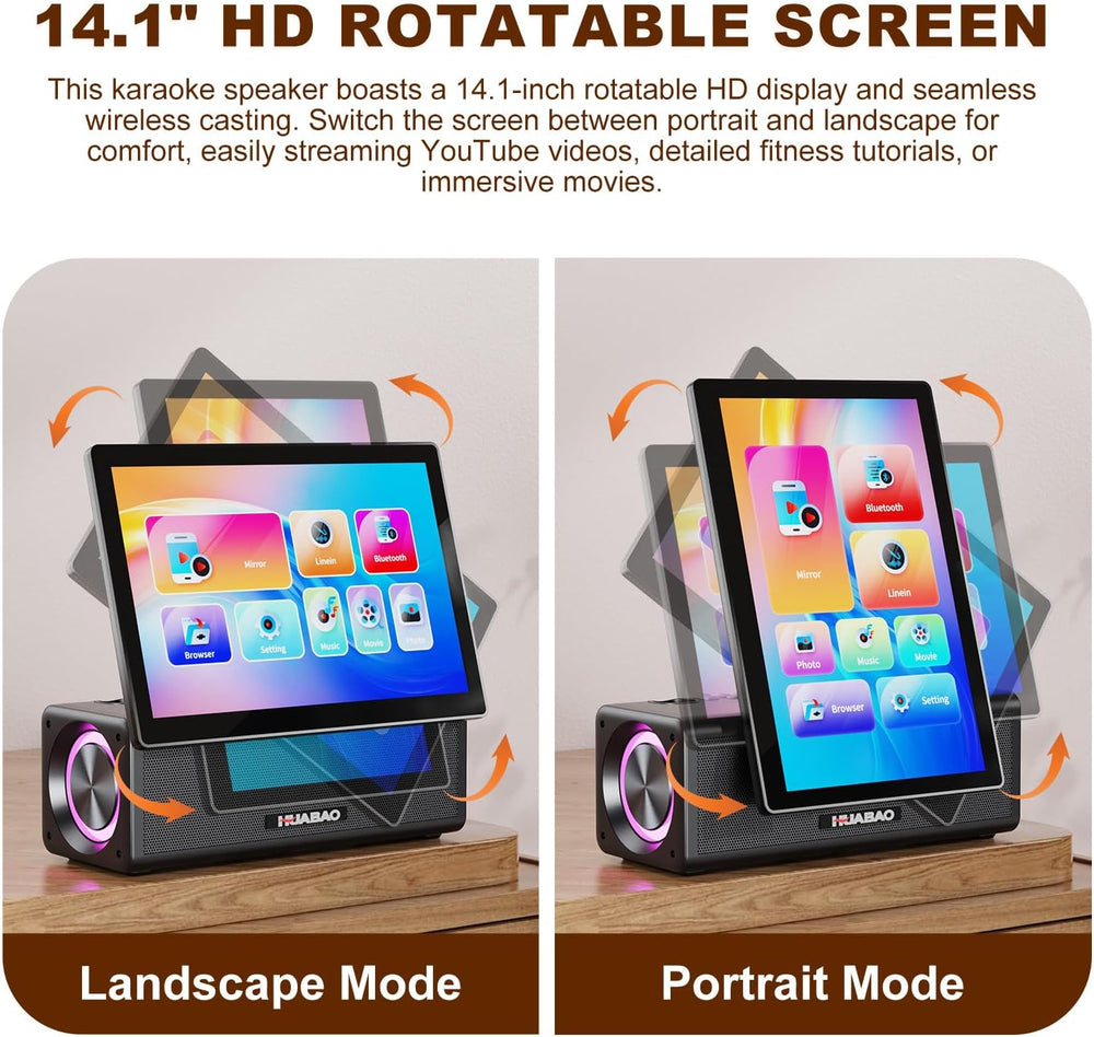 - 14,1-Zoll-HD-Bildschirm mit Drehfunktion – Perfekt für Karaoke und Unterhaltung zu Hause: Diese Bluetooth-Karaoke-Maschine verfügt über einen 14,1-Zoll-HD-Bildschirm mit Drehfunktion, der klare und detailreiche Bilder liefert. Wechseln Sie ganz