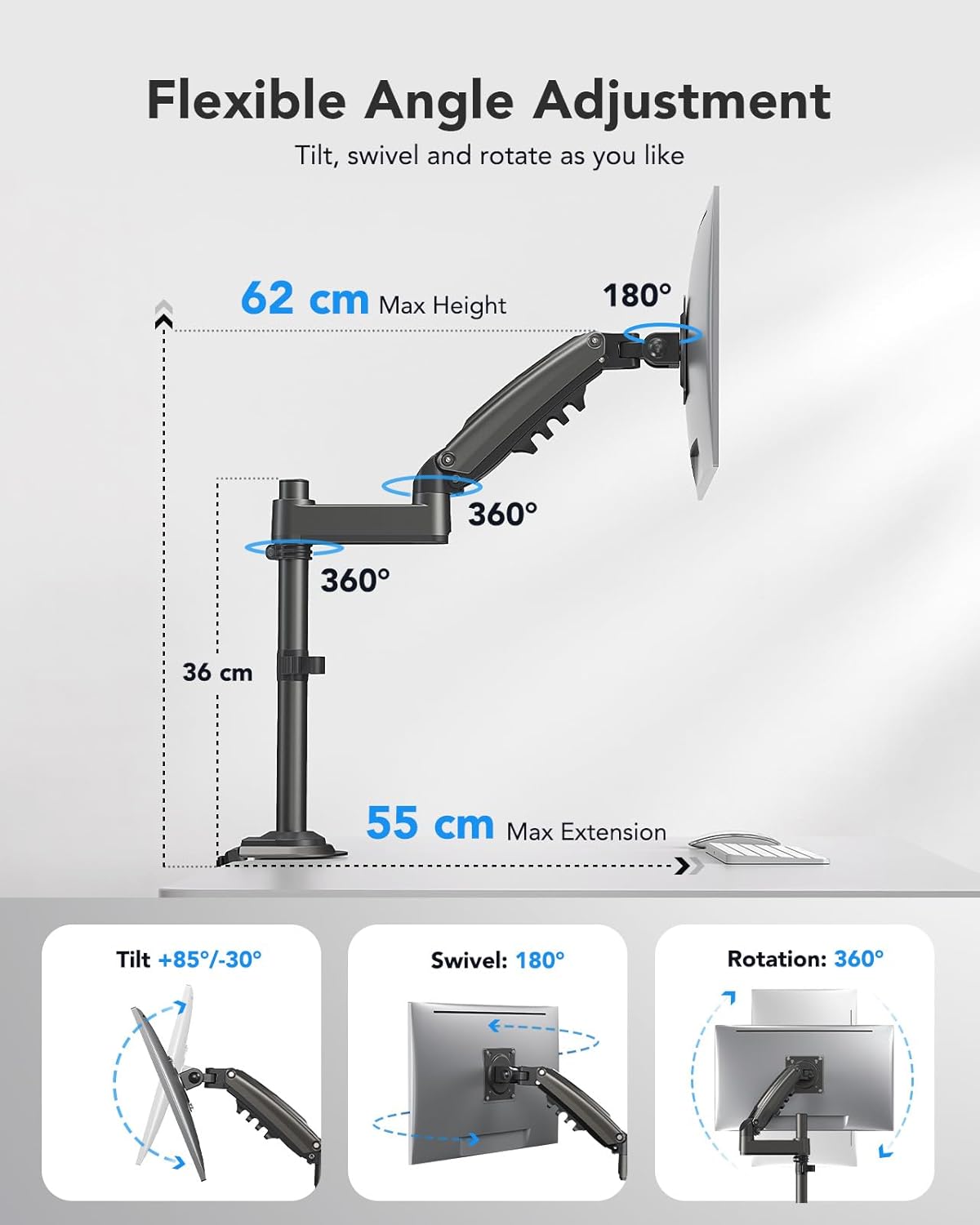 - 【Freie Einstellung】- Diese Monitor Arm Tischhalterung ist mit einer 36 cm Säule und einem Vesa Arm ausgestattet, damit kann der Monitor frei im Bereich von 55 cm nach oben und unten und 55 cm in horizontaler Richtung schweben. Der aus hochwertigem