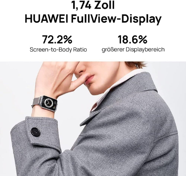 - 1.74-inch HUAWEI FullView Display: Mit ihrem perfekt eingerahmten 1,74 Zoll AMOLED-Display, ultraschmalen Rändern, einer Scree-to-Body-Ratio von 72,2% und einem 18,6% grösseren Display liefert Ihnen die HUAWEI WATCH FIT 2 alles, was Sie brauchen, an