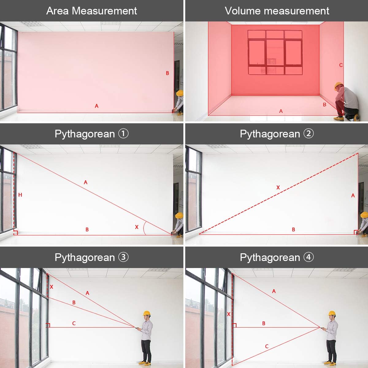 - MEHRERE Mess-Modi: Dieses Laser Entfernungsmesser unterstützt Winkel-, Längen-, Flächen-, Volumenmessung und Indirekte Messung (Pythagoras). Mit kontinuierlicher Messung, Addition/Subtraktionsfunktion, Selbstkalibrierungsfunktion, automatischer