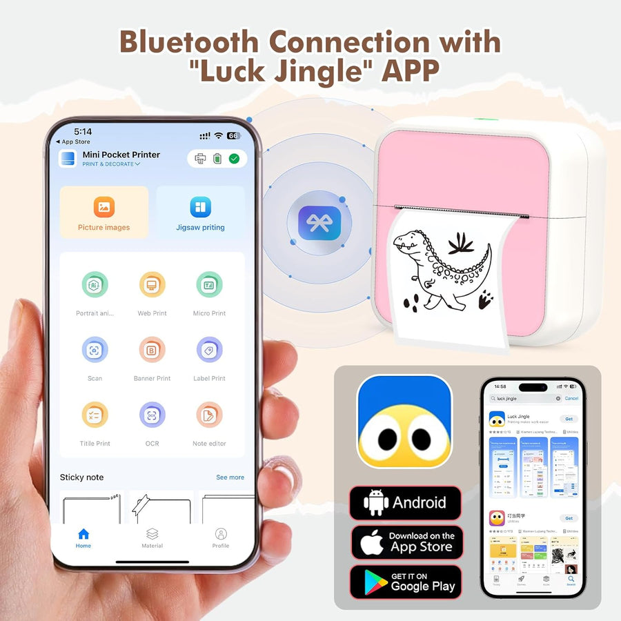- đăWie zu Benutzenă- Laden Sie einfach die "Luck Jingle" App herunter und beginnen Sie Ihre Druckreise. Es gibt drei Möglichkeiten, um schnell loszulegen: 1. Scannen Sie den QR-Code in der mitgelieferten Anleitung. 2. Suchen Sie "Luck Jingle" in
