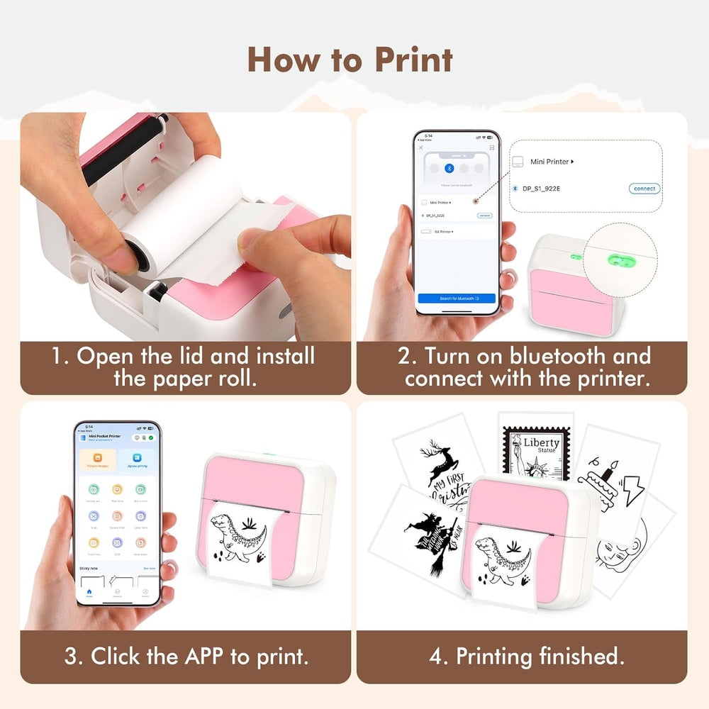 - đăKompakt & Tragbară- Mit einer Grösse von nur 8 x 8 x 4.5cm und einem Gewicht von nur 170g ist unser Mini-Taschendrucker kompakt genug, um in Taschen und Beutel zu passen. Sie können ihn mit in den Unterricht, in die Bibliothek oder in ein
