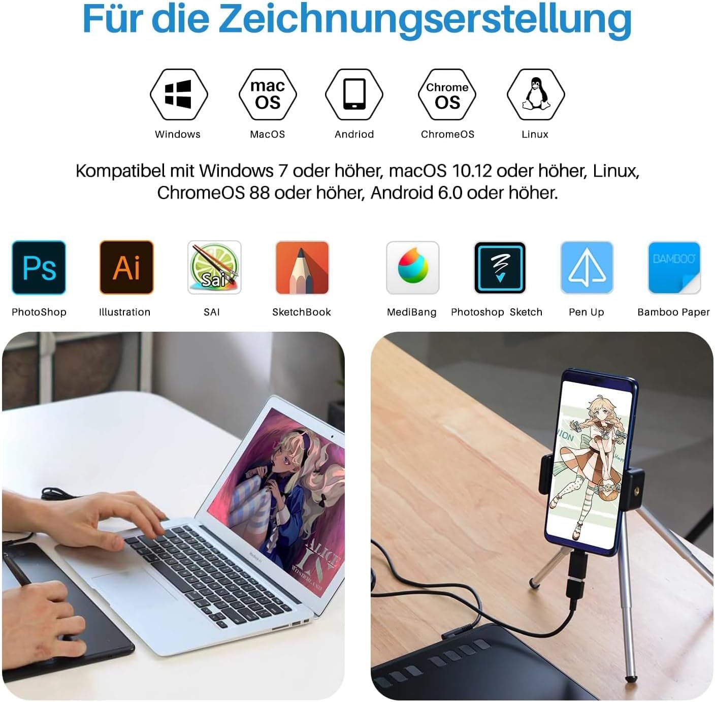 - 【Neue Kompatibilität】Das Huion Inspiroy H950P-Grafiktablett ist nicht nur für Windows 7 und Mac OS 10.11 oder höher geeignet, sondern kann auch mit Android 6.0 oder höher verwendet werden. Der Arbeitsbereich für PC und Android-Geräte ist