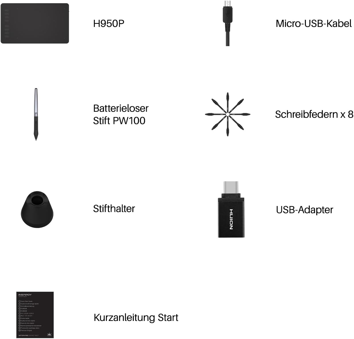 - 【Erweiterter Stift PW100】Das Huion Inspiroy H950P-Grafiktablett ist mit dem batterielosen Stift PW100 ausgestattet, mit dem Sie Ihrer kreativen Inspiration kontinuierlich freien Lauf lassen können, zusammen mit einer Neigungsunterstützung von ±