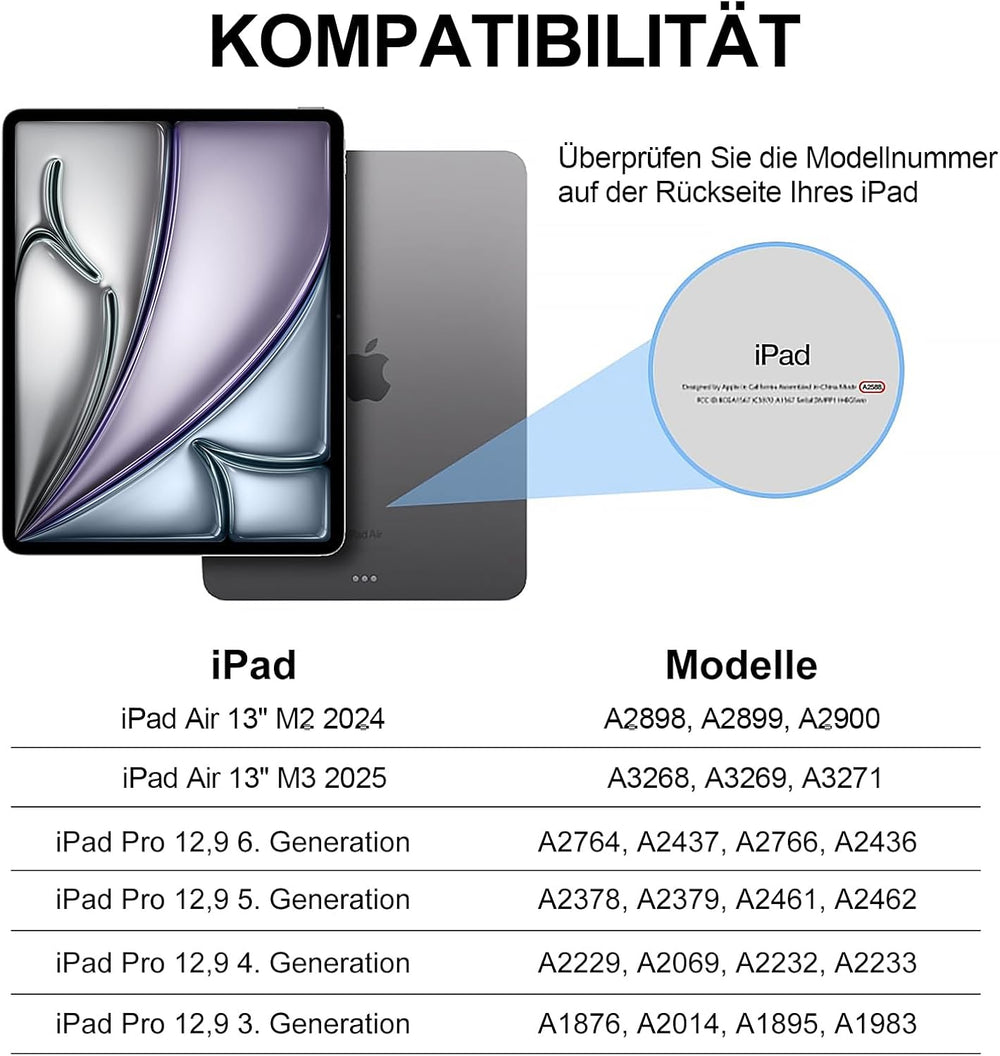 - ⌨️【Kompatibilität und Service】Diese Ledertasche ist perfekt kompatibel: iPad Air 13 Zoll 2025 M3, iPad Air 6 13 Zoll 2024 M2 (Modell:A2898 | A2899 | A2900),iPad Pro 12,9 Zoll 6. Generation 2022 (Modell: A2437 | A2764 | A2766), iPad Pro 12,9 Zoll