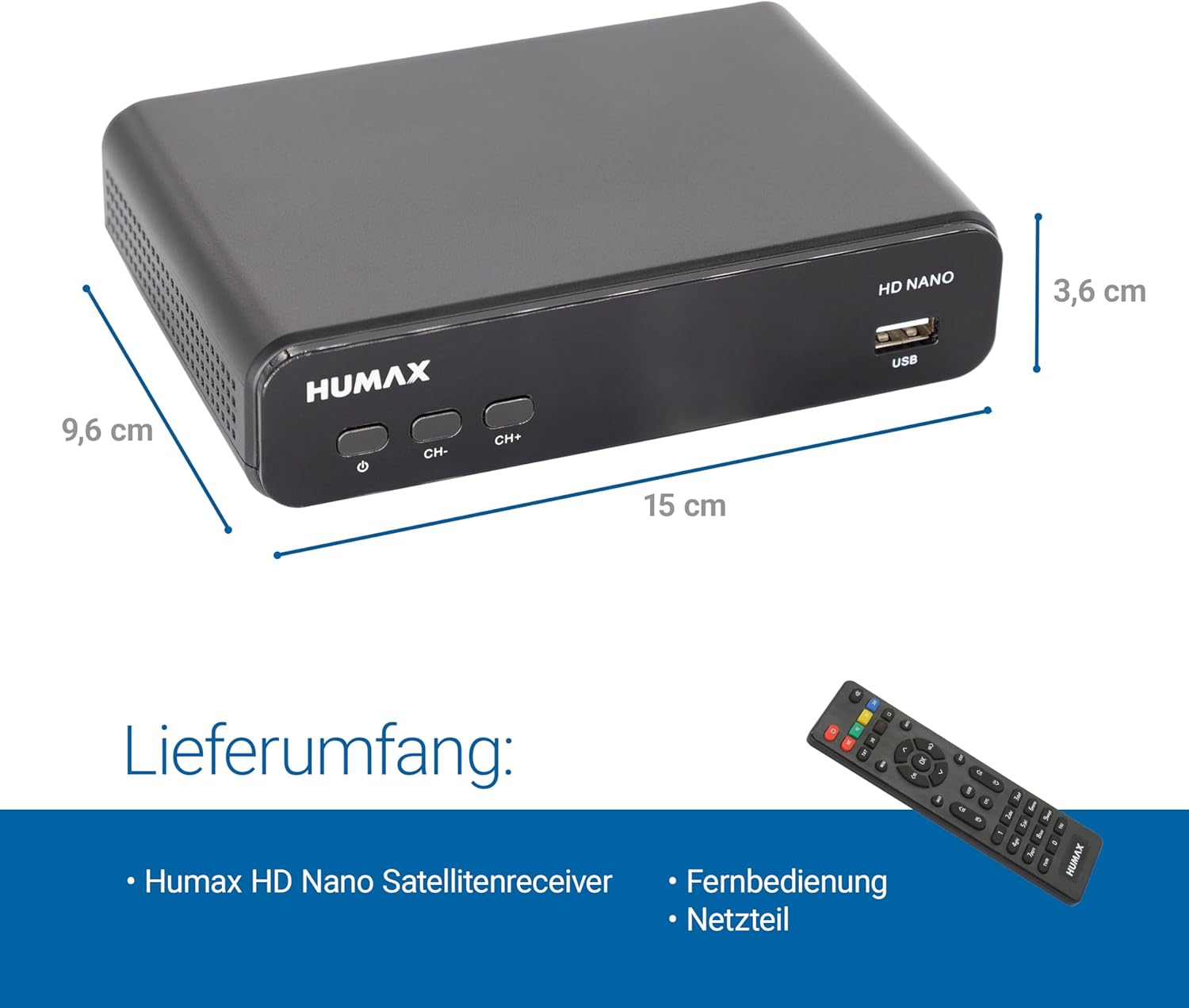 - LIEFERUMFANG: Geliefert bekommen Sie den HUMAX HD Nano Satellitenempfänger mit einer Fernbedienung inklusive Batterien, einen Netzstecker und deutscher Bedienungsanleitung.