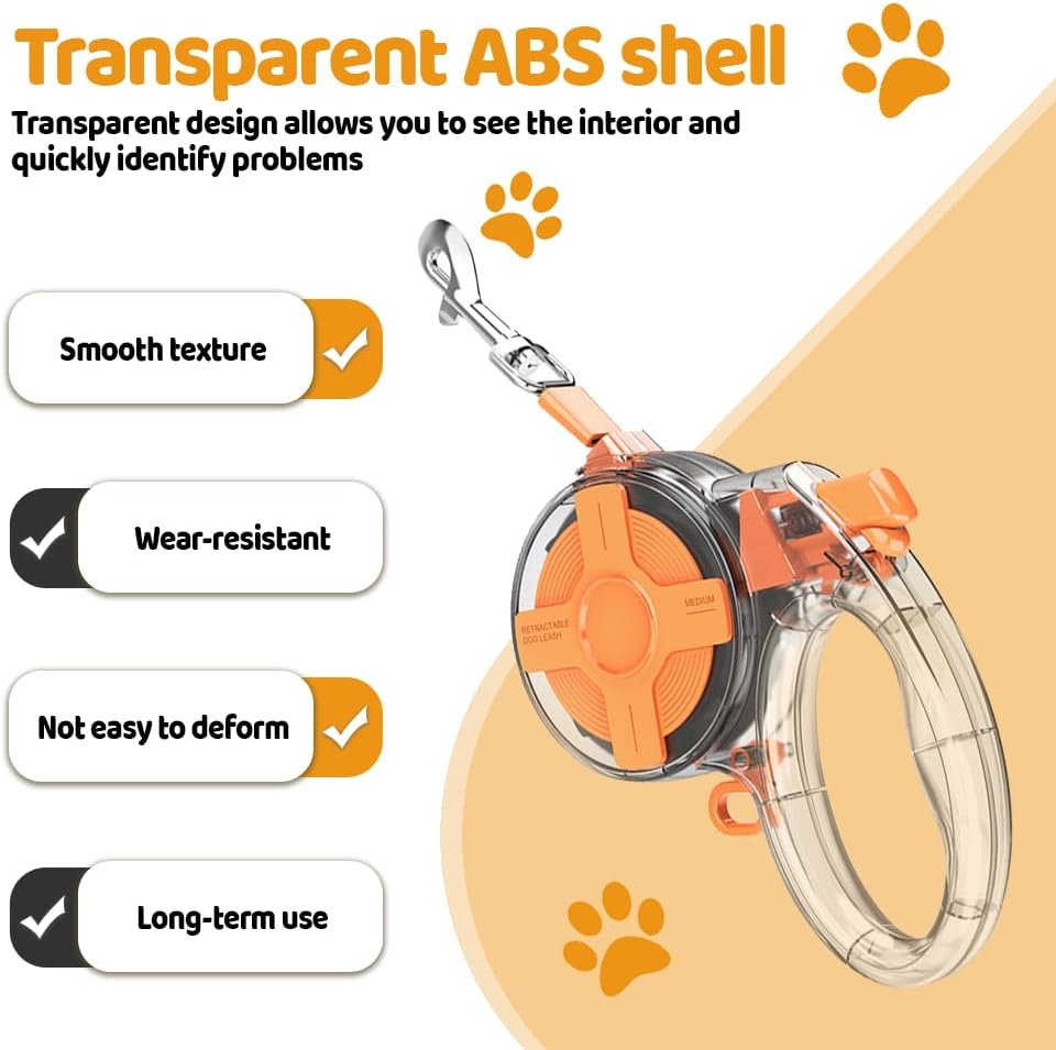 - Schnellbremsknopf: Ausgestattet mit einer empfindlichen Bremssperre, sperrt ein einfacher Druck die Leinenlänge und begrenzt so das plötzliche, aggressive Verhalten Ihres Hundes sofort. Durch erneutes Drücken wird die Leine wieder auf ihre