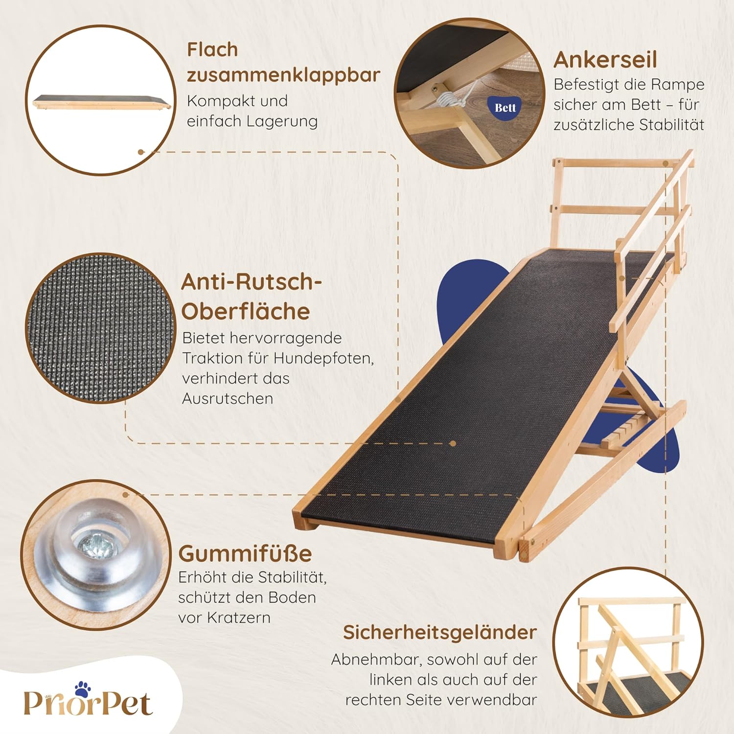 - SICHERHEITSGELÄNDER & ANKER-SEIL – STABILITÄT PUR: Seitliche Sicherheitsgeländer führen Ihren Hund, verhindern Fehltritte und können flexibel auf beiden Seiten angebracht werden. Das Anker-Seil fixiert die Rampe fest am Bett für maximale