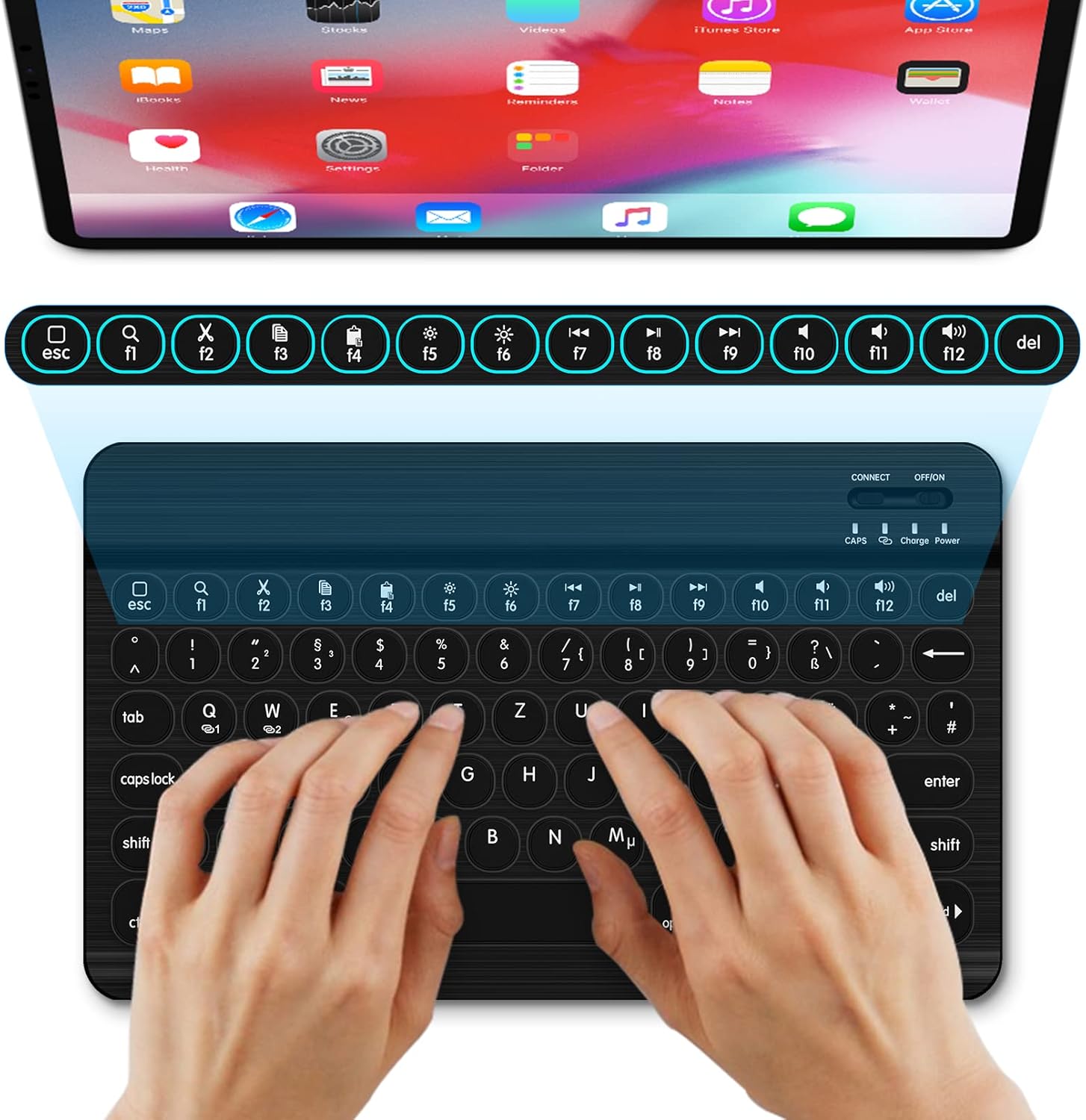 - [Stabile Bluetooth 5.0 und Starke Kompatibilität] HUOBAO bluetooth tastatur für ipad ist kompatibel mit mehreren Geräten, einschliesslich iPhone, iPad, MAC, Andriod, Windows, Huawei, Samsung, Lenovo und so weiter. die Bluetooth-Tastatur kann mit bis