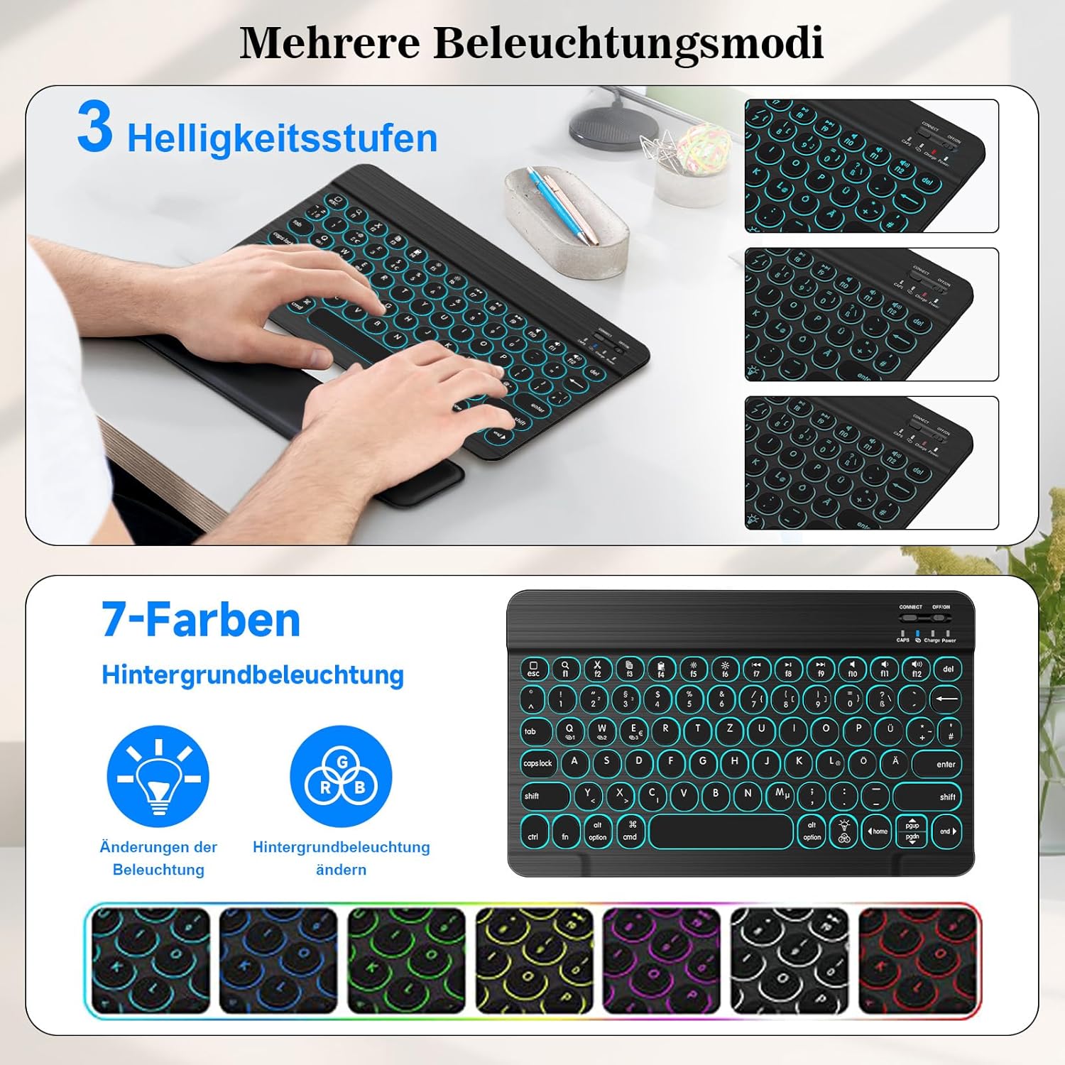 - [Wiederaufladbar und Energiesparmodus] Eingebauter wiederaufladbarer Lithium-Akku mit hoher Kapazität für über 100 Stunden Betrieb mit einer einzigen Ladung. Die Tastatur verfügt ausserdem über eine Energiesparfunktion, die die Tastatur nach mehr