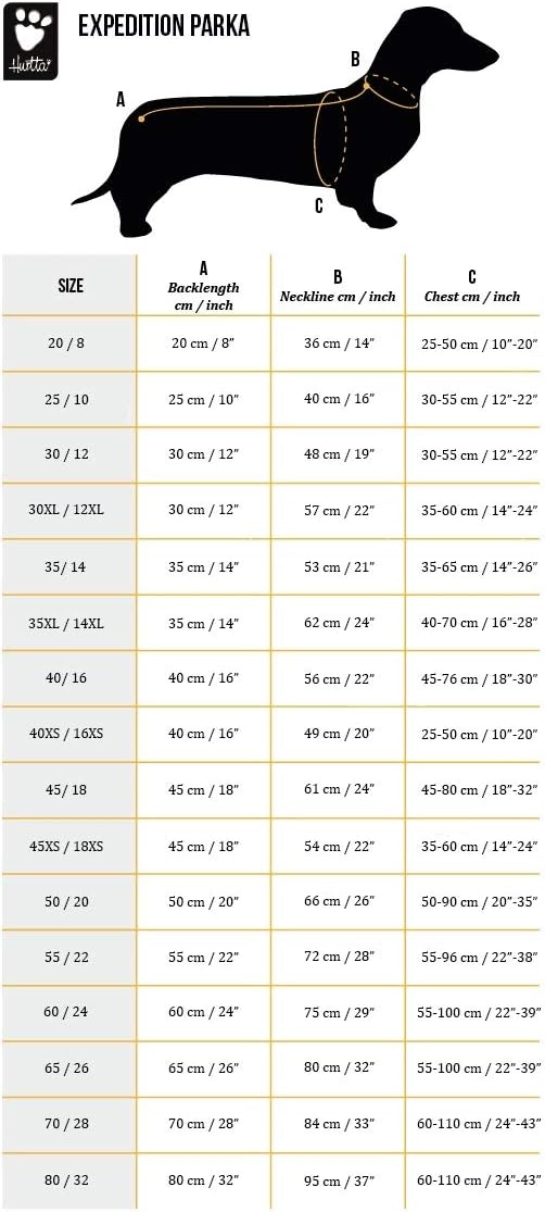- Raten Sie nicht die Grösse Ihres Hundes. Verwenden Sie die Grössentabelle zusammen mit der Grössenübersicht „Messen Ihres Hundes“ für eine perfekte Passform. Die Rückenlänge ist das Wichtigste für Bekleidung. Neben den Grundgrössen
