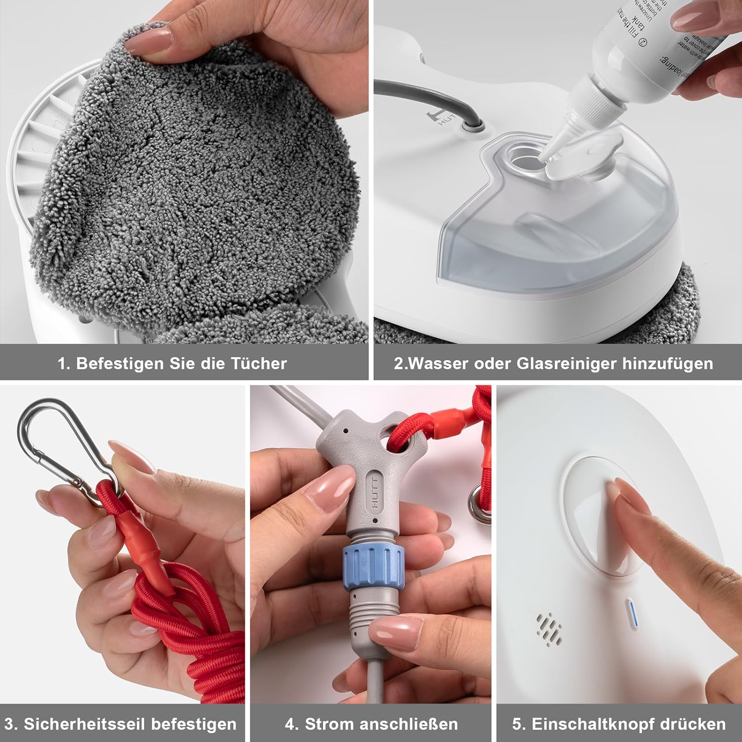 - ?80ML intelligenter Wischwasserfunktion?: Während des Putzens sprüht der Fensterputzroboter alle 5 Sekunden gleichmässig Wasser, ohne Wasserflecken zu hinterlassen. Gefüllt mit Wasser kann der Fensterroboter eine grosse Fläche von 70-80 ? putzen.;?Intelligente 3800Pa Saugkraft? : Der Fensterputzer Elektrisch erkennt automatisch den Verschmutzungsgrad und passt die Saugleistung dementsprechend an. Beim Putzen des sauberen Glases erhöht sich die Saugkraft für eine bessere Reinigungswirkung.;?Trocken- und Nasswischen kombiniert mit verschiedenen Szenen?Wählen Sie den nicht sprühenden Reinigungsmodus und den Sprühreinigungsmodus über die Fernbedienung, um verschiedene Anforderungen zu erfüllen. Es ist vielseitig einsetzbar, wie Esstische, Fenster, Badezimmerspiegel, Türen, Kleiderschränke .. Wir empfehlen, zuerst den Trockenwischmodus und dann den Nasswischmodus zu verwenden, um die beste Reinigungswirkung zu gewährleisten;?Trocken- und Nasswischen kombiniert mit verschiedenen Szenen?Wählen Sie den nicht sprühenden Reinigungsmodus und den Sprühreinigungsmodus über die Fernbedienung, um verschiedene Anforderungen zu erfüllen. Es ist vielseitig einsetzbar, wie Esstische, Fenster, Badezimmerspiegel, Türen, Kleiderschränke .. Wir empfehlen, zuerst den Trockenwischmodus und dann den Nasswischmodus zu verwenden, um die beste Reinigungswirkung zu gewährleisten;?USV & Sonderraupe?: Im Falle eines unerwarteten Stromausfalls kann der Fensterroboter noch 20 bis 30 Minuten lang am Fenster fest saugen. Mit einer und einem Sicherheitsseil der Qualität des Kletterseils ist der Fensterputzroboter ausgestattet, um die Sicherheit beim Fensterputzen auf hohen Stockwerken zu en. Hinweis: Der Fensterreiniger muss beim Arbeiten an die Stromversorgung; Dieser Fensterreiniger wird für die regelmässige Fensterpflege empfohlen. Wenn das Fenster längere Zeit nicht gereinigt wurde, reinigen Sie es bitte vor, bevor Sie diesen Fensterreiniger verwenden.; Wenn Sie Fragen haben, Sie uns bitte ;