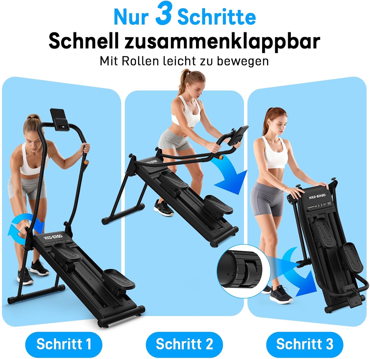 - Faltbares Design mit Transportrollen: Durch das klappbare Design lässt sich der Stepper platzsparend verstauen. Die integrierten Rollen erleichtern das Bewegen und machen ihn ideal für kleine Räume oder das Home Gym.