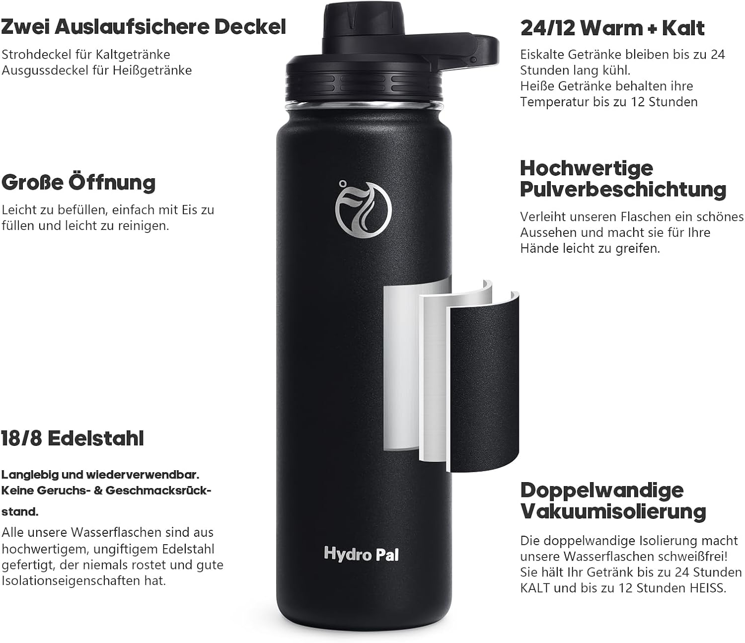 - 💧PRÄZISES DESIGN💧 Der perfekte Vakuumverschluss und die doppelwandige Isolierung machen die Trinkflasche schweissfrei. Sie hält Ihr Getränk bis zu 24 Stunden KALT und bis zu 12 Stunden HEISS. Auch für kohlensäurehaltige Getränke geeignet.