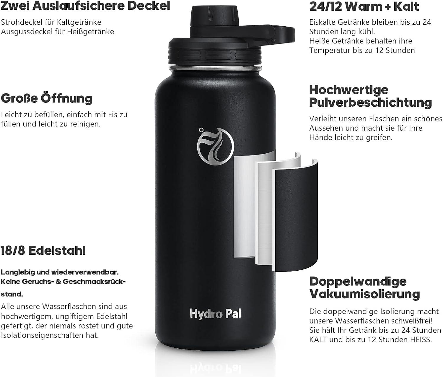 - 💧PRÄZISES DESIGN💧 Der perfekte Vakuumverschluss und die doppelwandige Isolierung machen die Trinkflasche schweissfrei. Sie hält Ihr Getränk bis zu 24 Stunden KALT und bis zu 12 Stunden HEISS. Auch für kohlensäurehaltige Getränke geeignet.