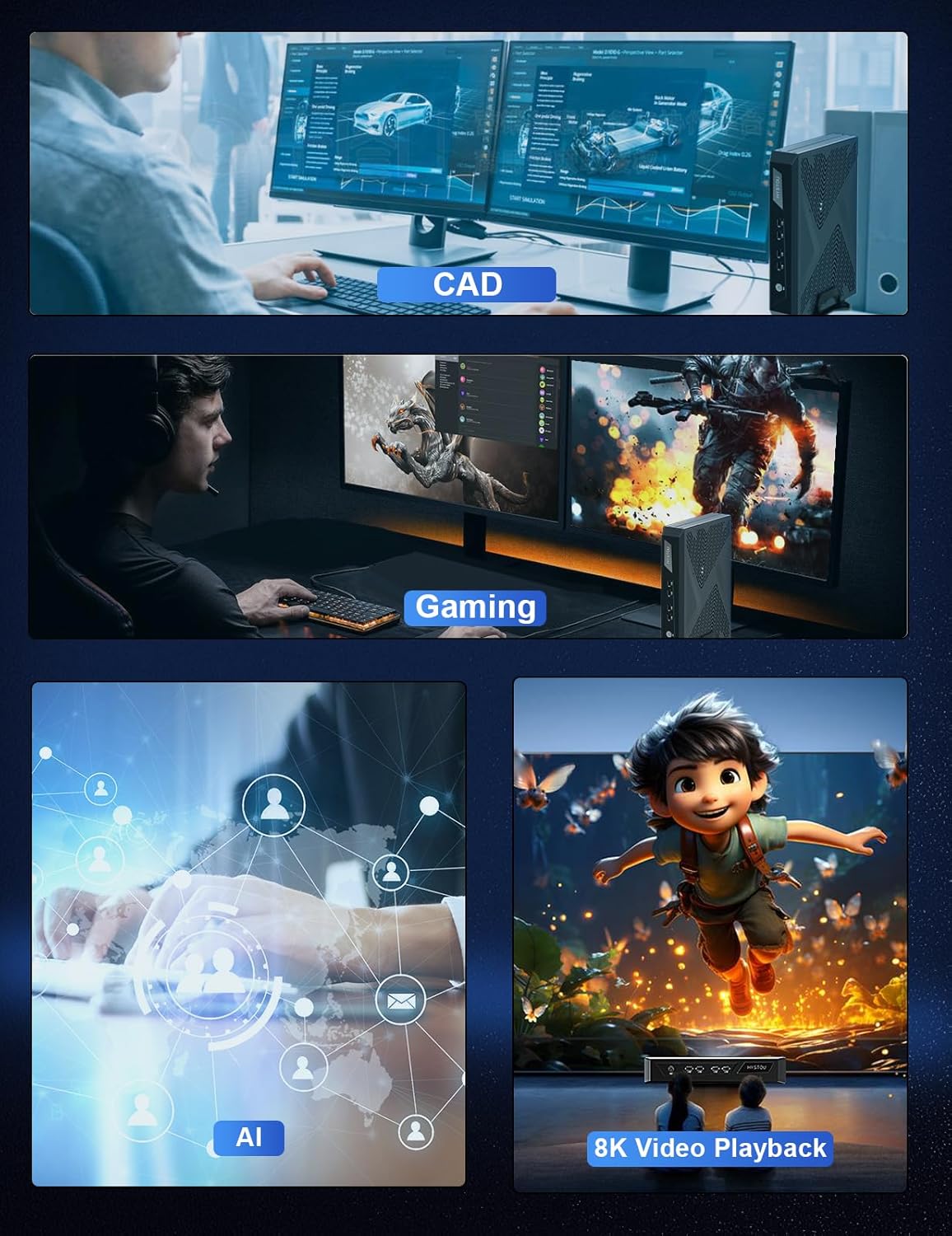 - 【UHD Display mit vier Bildschirmen】Dieser Gaming PC unterstützt 2*HD 4K@60Hz (4096X2604), DP 8K@60Hz (7680x4320) und DVI 2K@60Hz Display. 4 Bildschirme können die Büroeffizienz verbessern und ermöglichen Ihnen müheloses Multitasking. Sie können