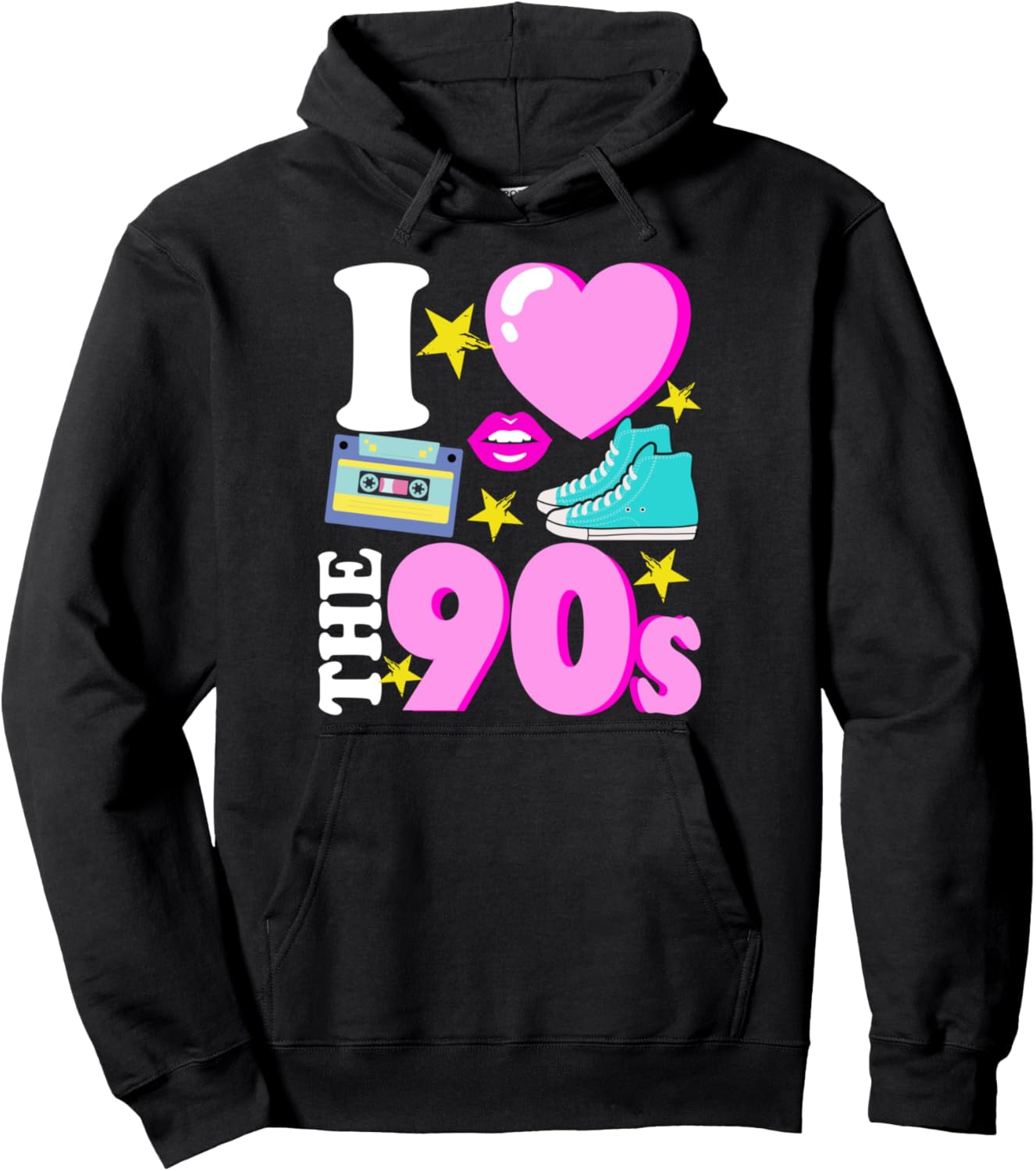 PRODUKTBESCHREIBUNGEN Cooles 90er Jahre Retro T-Shirt. Perfektes Outfit für eine Throwback Party oder als Geschenk für alle die, die während den neunziger Jahren aufgewachsen sind und sie lieben. Tolles farbenfrohes Shirt und der Aufschrift I love the 90's, einer Audio Kassette und pinke Lippen.