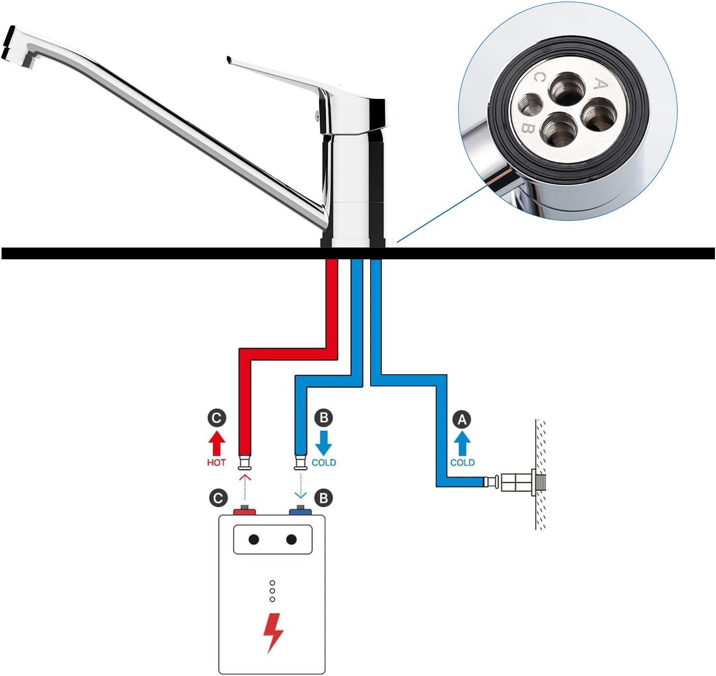 - Niederdruck-Küchenarmatur: Die Küchenarmatur ist mit drei Anschlussschläuchen ausgestattet und eignet sich für offene Warmwasserbereiter wie beispielsweise einen Boiler.